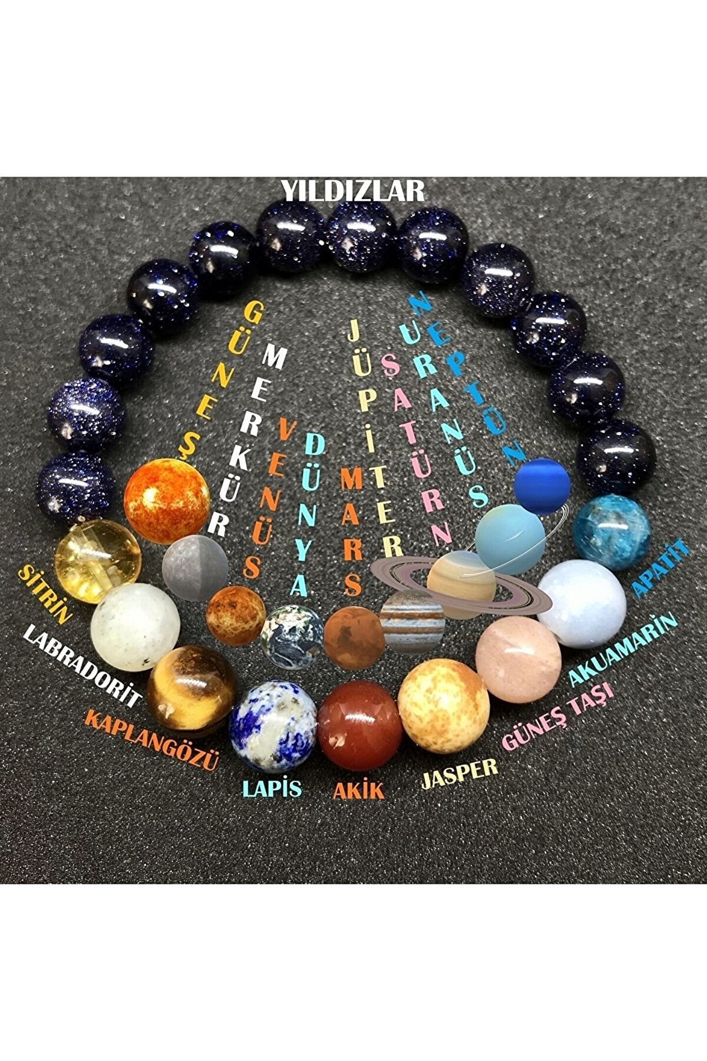 Ürün özel tasarım kutusunda gönderilir. ; Kutu içeriğinde her taşın bilgilendirme katları da bulunur. ; Taşlarımız A+ kalitedir, sahte taşlarla kıyaslamayınız. ; Kutu içeriğinde yedek misina ip ve yedek doğal taş bulunur. ; Standart bilek ölçüsünde gönderilir, sıkı veya bol gelmesi durumda kutu içeriğindeki ekipmanlarla kolayca ayarlayabilirsiniz. ; Üründe Sitrin, Labradorit, Kaplangözü, Lapiz Lazuli, Akik, Jasper, Güneş Taşı, Akuamarin, Apatit, Yıldız doğal taşları bulunmaktadır. ; Kutu içeriğinde sürpriz hediyeler de bulunabilir. ;