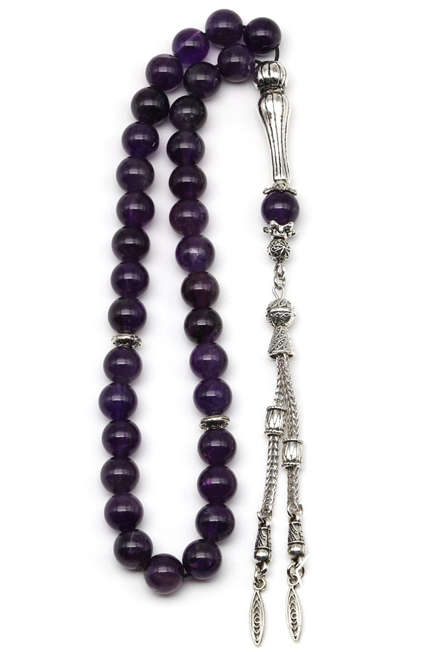 Not: Püskül Ucundaki Şekiller Stok Durumuna Göre Değişiklik Gösterebilir.;Ağırlık - 38 gr.;Tane Boyu - 8 mm;Tane Eni - 8 mm.;İmame Uzunluğu - 3,5 cm;Püskül Uzunluğu - 10 cm;Toplam Uzunluğu - 26 cm ( Püskül Dahil );Tane Adeti - 33 Adet;TÜM TAŞLARIMIZIN ORJİNALLİĞİ FİRMA GÜVENCEMİZ ALTINDADIR!;AMETİST - AMETHYST (Pozitif Enerji Taşı)Ametist taşı, sahip olduğu enerji sayesinde bulunduğunuz ortamın negatif enerjisini kısa sürede yok ettiği düşünülen bir taştır.; Bu sebeple meditasyon taşları içinde en çok tercih edilen doğal taşlardan biri olmuştur.; Antik çağlardan bu yana zararlı alışkanlıklardan arınmak için yardımcı taş olarak kullanıla gelmiştir.; Uyumlu Burçlar ; Balık, Koç, Yengeç, Akrep ve YayUyumlu Çakralar ; 6.Alın Çakrası (Üçüncü Göz) ve 7.Taç ÇakrasıDoğal Taş Nasıl Arındırılır?Tütsüleme: Tütsü kullanarak yapılan enerjetik temizlik, taşın üzerindeki negatif enerjiyi dağıtmak için etkilidir.; Bir elinize taşı bir elinize tütsüyü alıp dumanıyla 15-20 saniye boyunca taşınızı temizleyebilirsiniz.; Akan Su Altında Temizleme: Doğal taşların akan su altında tutulması, üzerlerindeki enerjik kirliliği giderir.; Akar suyun altında 2-3 dakika yıkayarak taşınızı temizleyebilirsiniz.; Toprağa Gömme: Doğal taşlar, doğanın enerjisini emmek için toprağa gömülebilir.; Bu yöntem, taşın enerjisinin dengelenmesine yardımcı olur.; Taşınızı 1 gün toprağa gömerek temizleyebilirsiniz