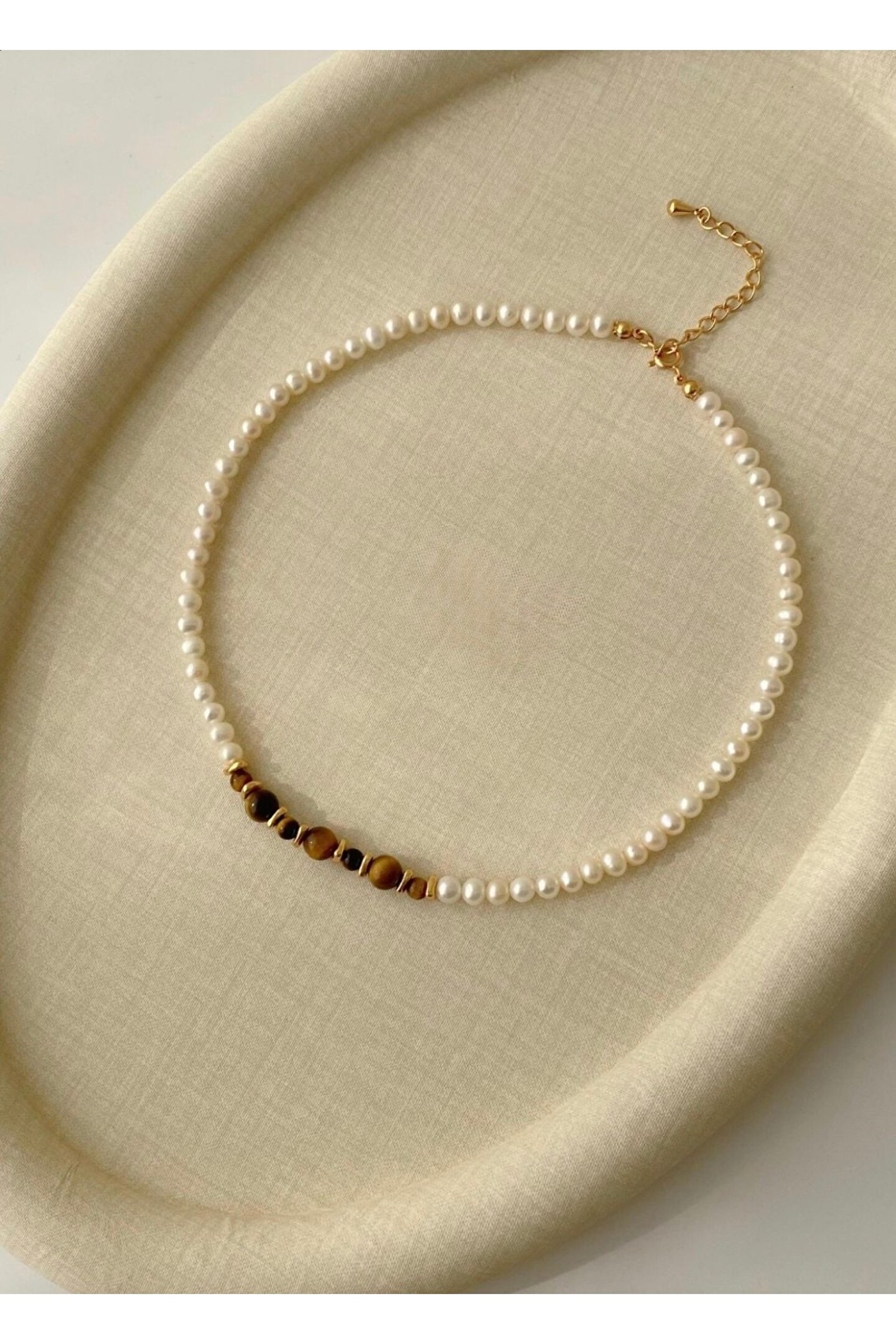 Sertifikalı inci ve kaplan gözü taşından tasarım kolye;Kolye uzunluğu 40 cm + 5-6 cm uzatma zinciri;Kullanılan taş boyutu: 4 mm inci ve 6 ve 4 mm kaplan gözü;