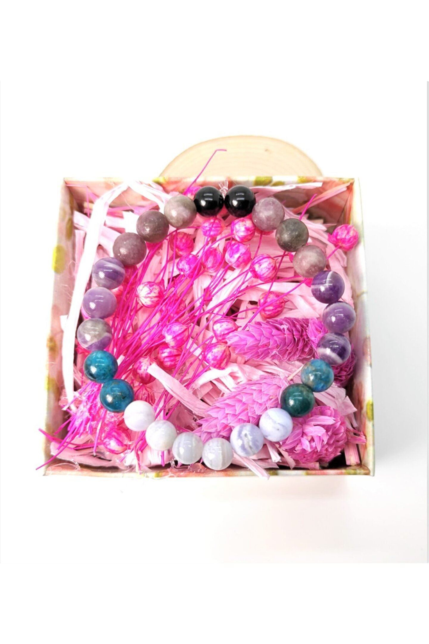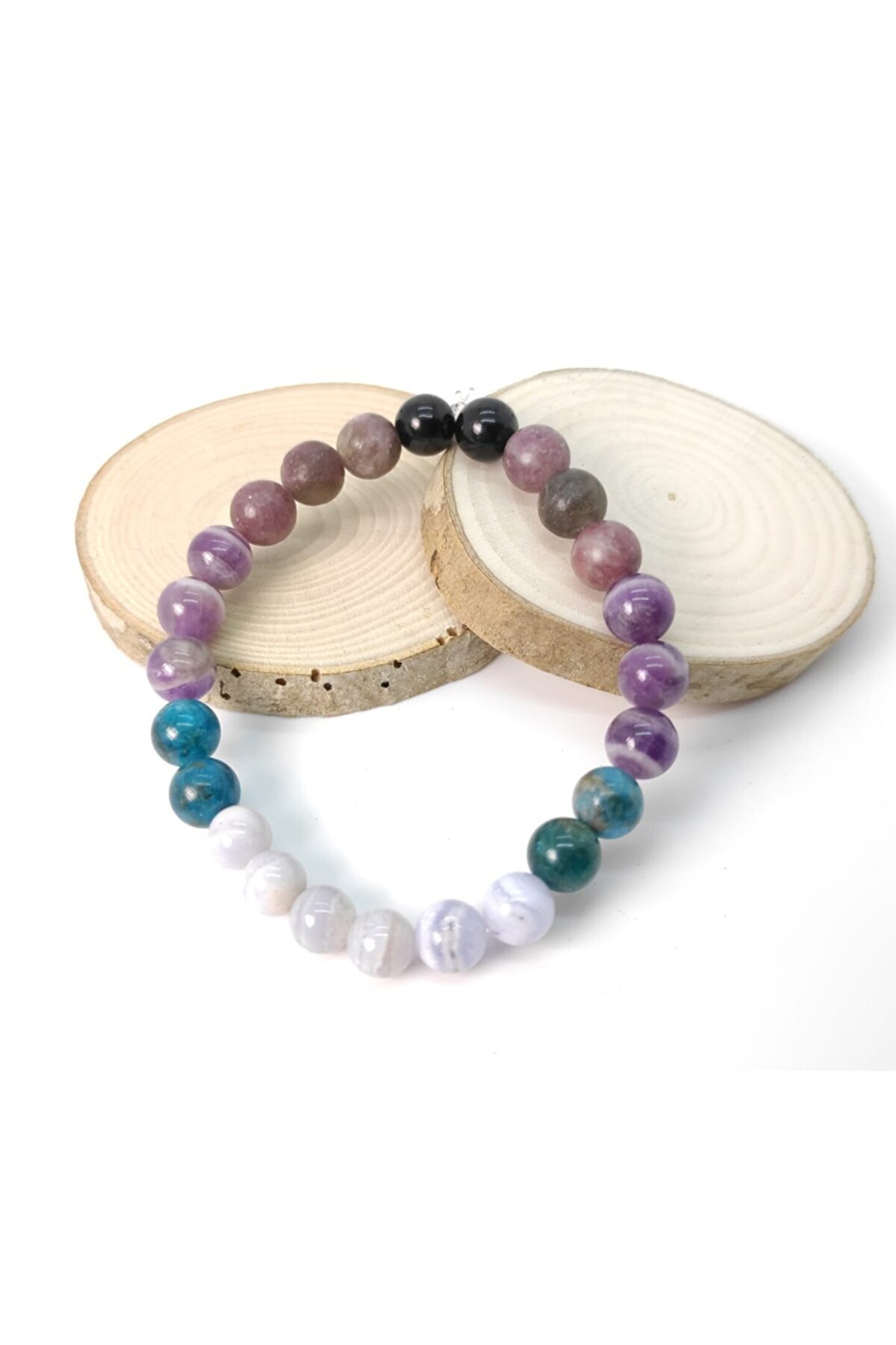 Doğal taş kullanımı sayesinde her bileklik benzersiz ve otantik bir görünüm sunar; Mavi dentrit akik, apatit, ametist ve lepidolit gibi değerli taşların birleşimiyle zenginleştirilmiş tasarım, şıklığınızı tamamlar; 8 mm çapındaki bu bileklik, 18 cm uzunluğunda zarif bir aksesuar olarak bileğinizde rahatça durur; Siyah turmalin taşı ile desteklenen bu bileklik, hem günlük kullanım hem de özel günler için idealdir;