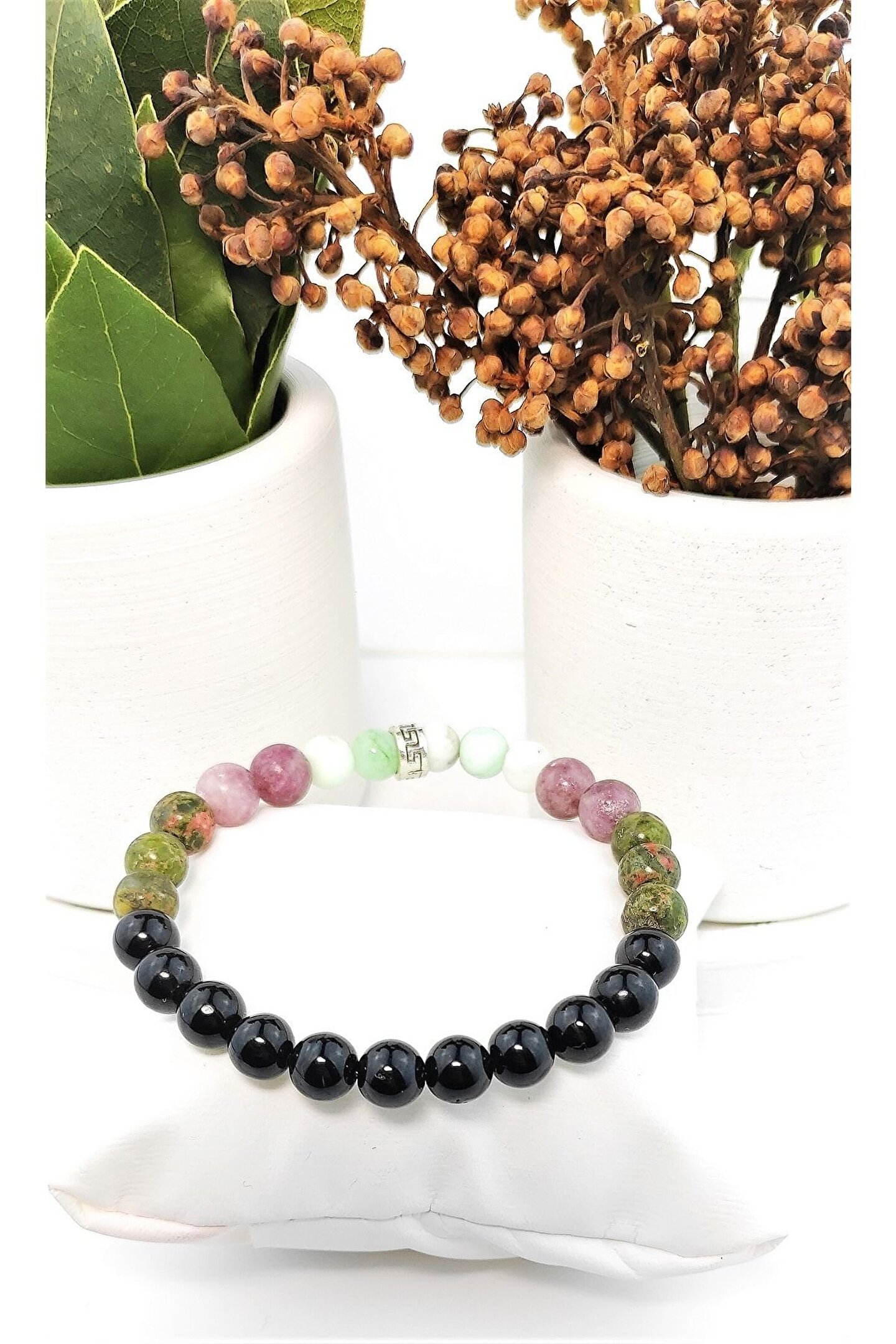 Doğal taş kullanımı sayesinde her bileklik benzersiz ve otantik bir görünüm sunar; Siyah turmalin, unakit ve lepidolit gibi değerli taşların birleşimiyle zenginleştirilmiş tasarım, şıklığınızı tamamlar; Esnek yapısı ile gün boyu rahat bir kullanım sağlar ve farklı bilek ölçülerine uyum sağlar; El yapımı olması, her bir bilekliğin kendine özgü bir karaktere sahip olmasını garanti eder;