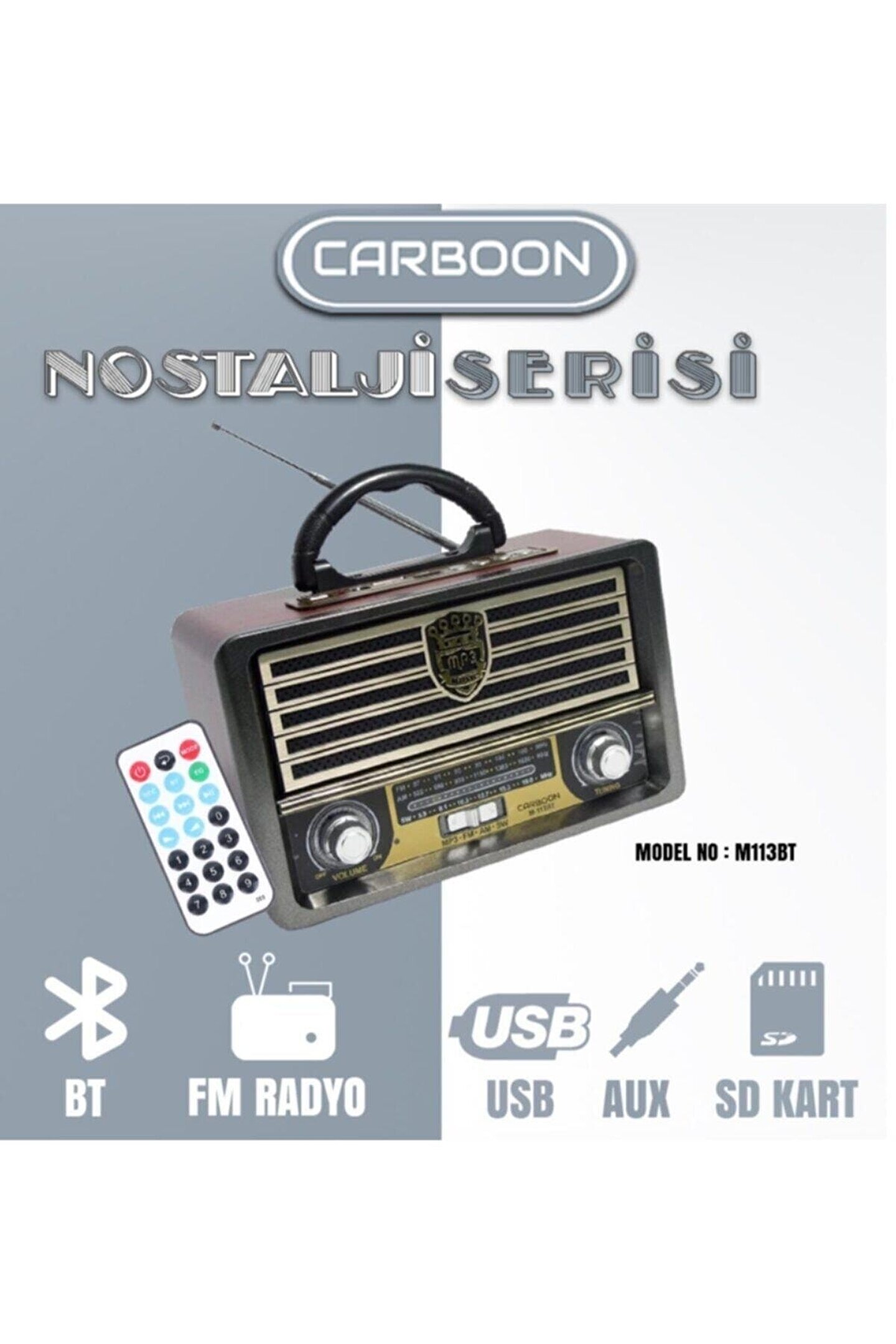 M; 113BT NOSTALJİK BLUETOOTH FM RADYO Bluetooth Portable Şarjlı Hoparlörler SD/ kartlar ile Usb Flash Belleklerin içindeki MP3 leri okuyabilen standart üstü ürünlerdir; FM frekansları ile istediğiniz radyo istasyonunu dinleyebilirsiniz Şık tasarımı ve Taşınabilir yapısı ile istediğiniz yere götürün; Bahçenizde, Balkonunuzda, Piknikte, Seyahatte, Elektiriğe uzak yerlerde şarjlı yapısı ile rahatça kullanabilirsiniz; Sesli ders notlarınızı dinleyebilirsiniz; Ayrıca notebook pc mp3 çalar gibi ürünlere ihtiyaç kalmadan radyodan veya hafıza kartı usb bellekten müziklerinizi dinleyebilirsiniz Güçlü Ses ile dilediğiniz müziğe doyacaksınız; FM / AM / SW 1; 2 4 BAND RADYO USB / SD/ TF KART GİRİŞİ BLUETOOTH FONKSİYONU DSP RADYO / STEREO Dahili ŞARJ EDİLEBİLİR BATARYA PİL YUVASI(BÜYÜK BOY PİL X2) ŞARLI ve PİLLİ UZAKTAN KUMANDALI 2 ADET D BÜYÜK PİL İLE ÇALIŞIR; TEYP FİŞİ KUTU İÇERİSİNDE VARDIR; TEYP FİŞİ İLE ŞARJ EDİLEBİLİR; DC 5 V ADAPTÖR GİRİŞİ VARDIR; (ADAPTÖR KUTU İÇİNDEN ÇIKMAZ; ) ÜRÜNDE TEK HOPARLÖR VARDIR SAĞ TARAF GÖRSEL OLARAK YAPILMIŞTIR; KUTU İÇERİĞİ : NOSTALJİK RADYO UZAKTAN KUMANDA TEYP FİŞİ BOY : 23 CM DERİNLİK : 9,5 CM YÜKSEKLİK: 16 CM;
