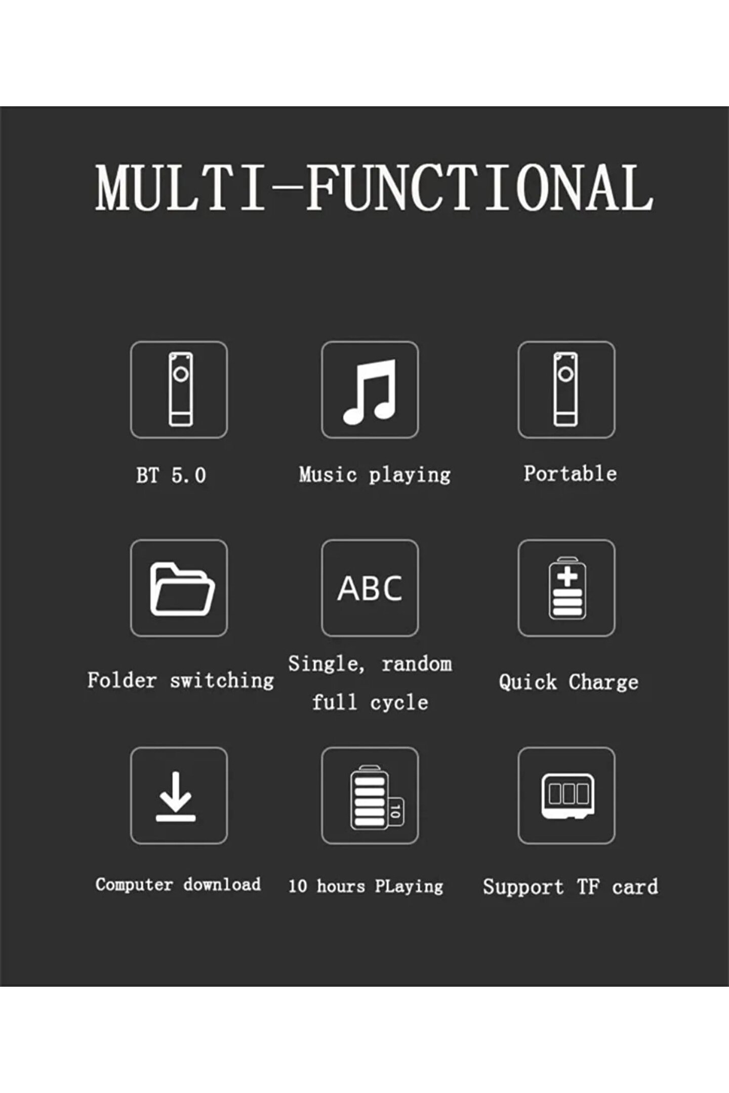 Not: yerleşik bellek yoktur. ; Bu yüzden ekstra bir TF kartı almanız gerekiyor. ; Özellik: 1. ; Dahili şarj edilebilir lityum pil, çeşitli şarj yöntemleri. ; 2. ; Harici bellek: 32GB TF kartına kadar destekler ve mikro SD / TF kart okuyucu (belleksiz) olarak da kullanılabilir. ; 3. ; Ses formatı: MP3 formatı. ; 4. ; Ayrıca MP3 ve çıkarılabilir depolama diski işlevi vardır. ; Özellikler: Arayüz: USB 2.0 Kulaklık jakı: 3.5mm Çalma süresi (saat): yaklaşık 7 saat Bekleme süresi (saat): 48 saatten fazla Çalışma modu: tuş Pil tipi: dahili lityum pil (dahili) Boyut: 8.5x2.5x0.9cm Paket İçeriği: 1 MP3 çalar (hafıza kartı olmadan) modeliMP302 btürün türüBT 5.0 ile mp3 çalarHafıza4GB,8GB,16GB, diğerleri (belleksiz)fonksiyon 1BT 5.0, dahili hoparlörişlev 2tek döngü, tek döngü, rastgele döngü, klasör değiştirmeRenkbeyaz, siyah, mavi, pembe, yeşildoğum yeriçin shenzhenÖlçü birimiParçaürün boyutu85*25*10mmDestek Ses formatıMp3Ağırlık20gtf sd kart desteği128MB-16GB-32GBpil150mAhÇalışma zamanı<10 saatAksesuarlarAmbalaj kutusu + Manuel + kulaklık;