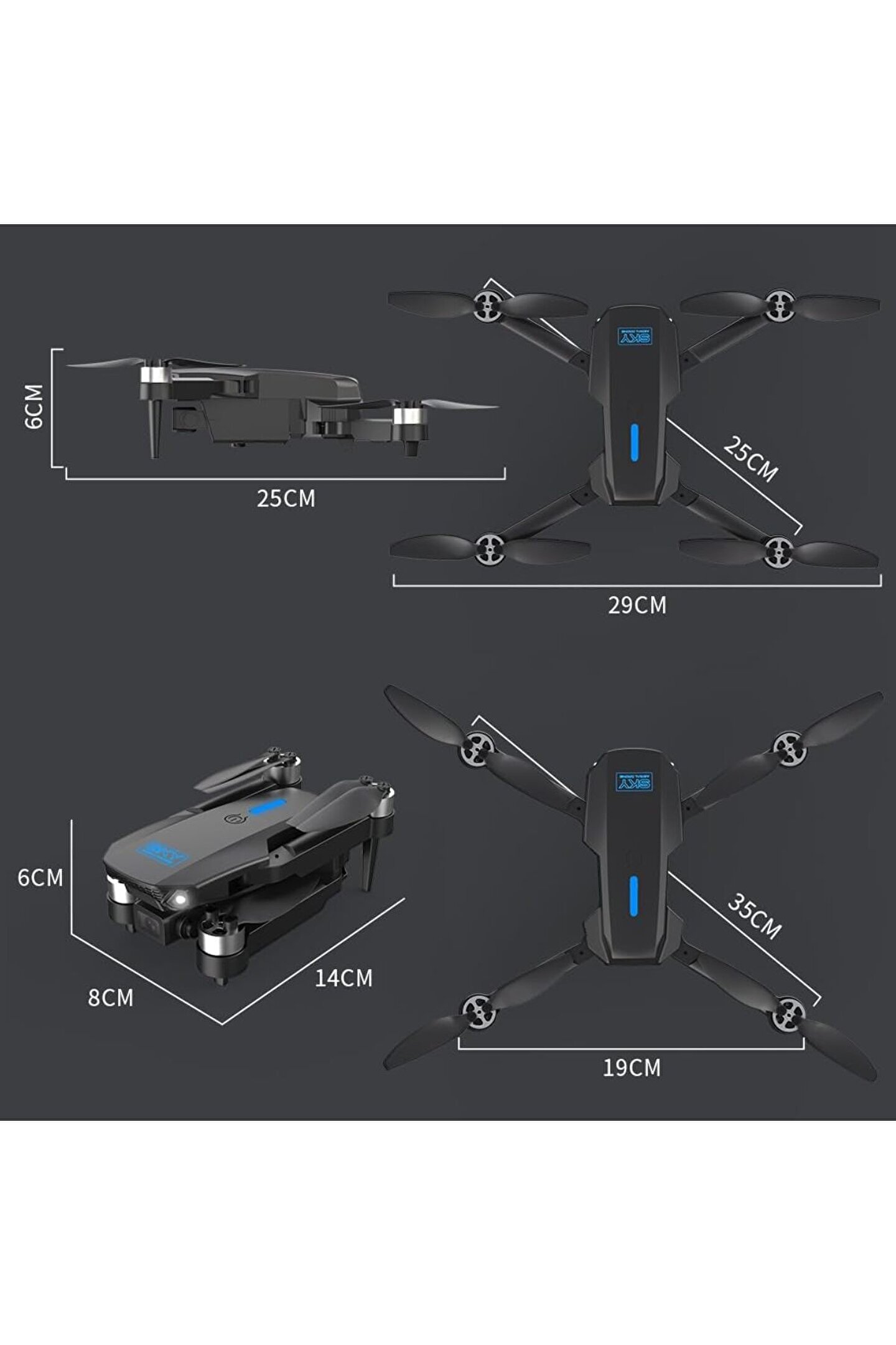 Fonksiyonlar: Yukarı/aşağı, ileri/geri, sol/sağ dönüş, yan uçuş, LED ışık, başsız modu, tek tuşla otomatik dönüş, irtifa tutma modu, optik akış konumlandırma, WiFi FPV