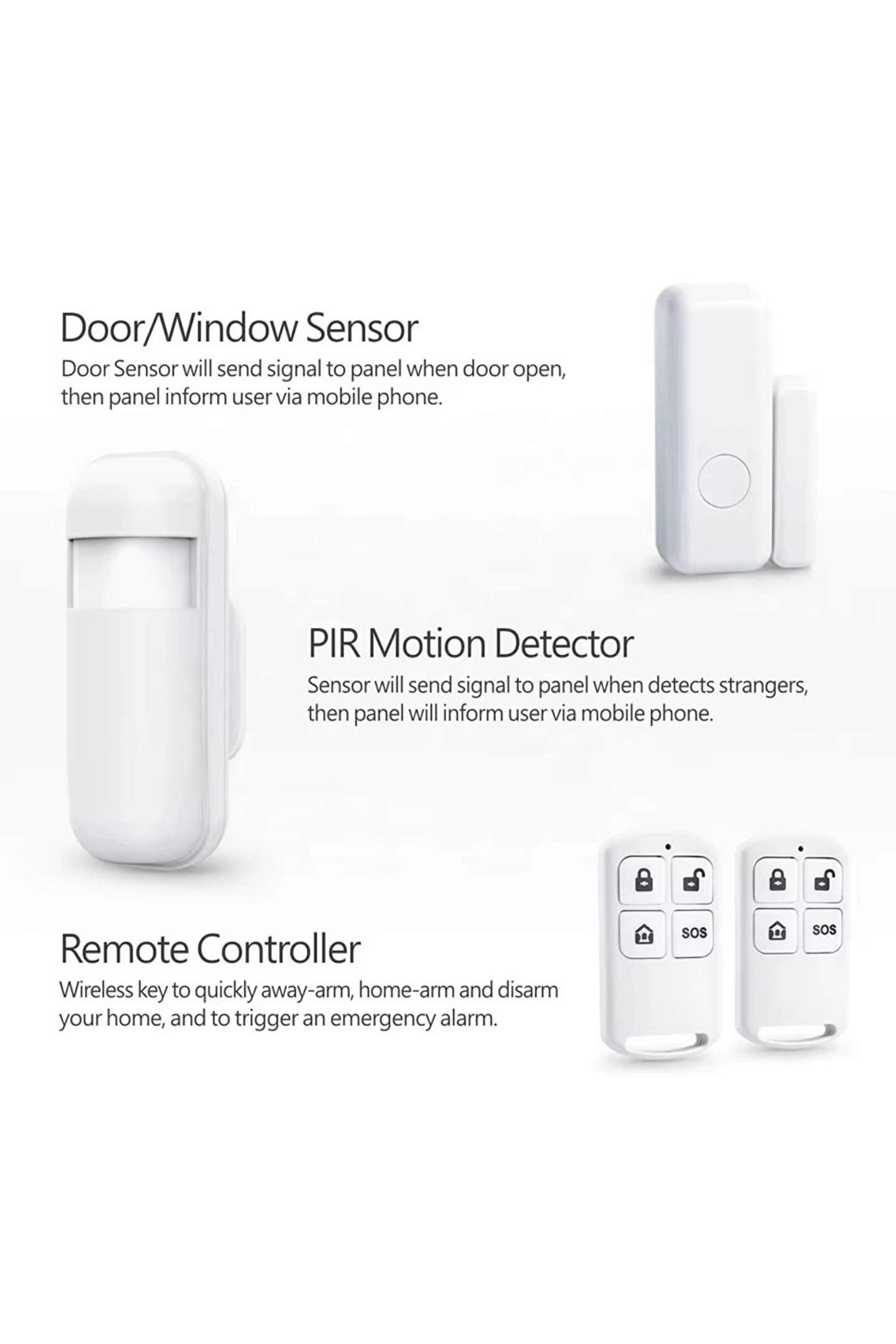 Uzak kol: tüm sensörleri etkinleştirir (dışarıda olduğunuzda, örneğin PIR, kapı sensörleri).