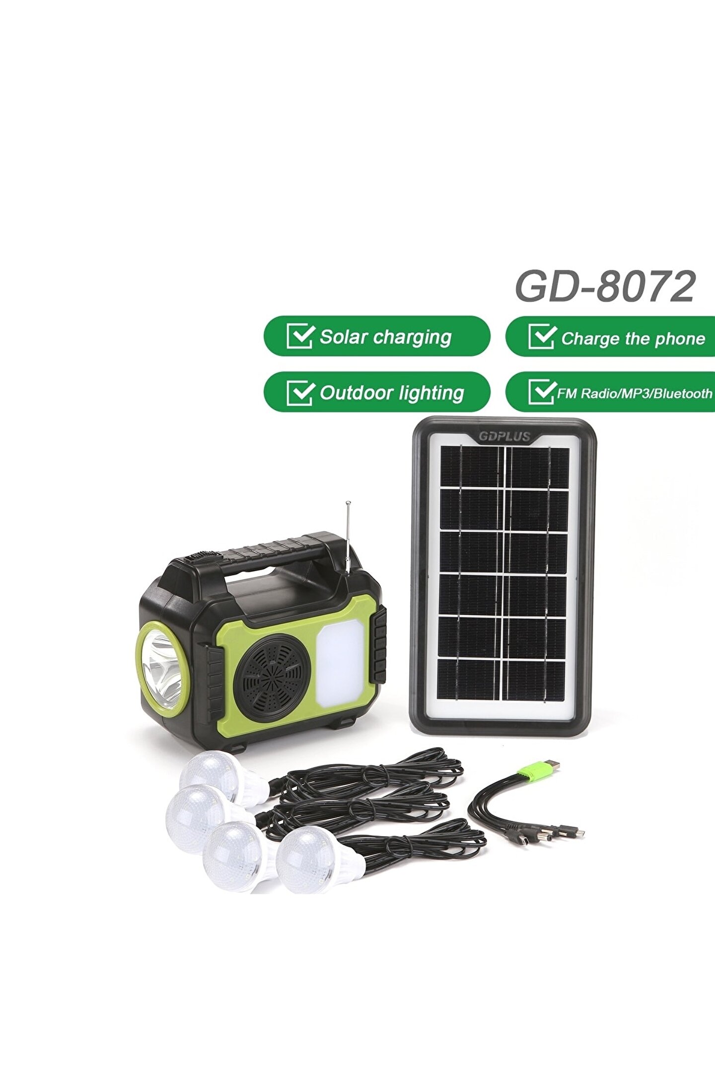 Solar aydınlatma ve şarj sistemi; Sistemde güneş paneli, LED el feneri, her biri ayrı açma/kapama anahtarlı 4 adet LED lamba, birden fazla cihazı şarj etmek için USB kablo demeti ve FM radyo bulunmaktadır; TF kartı destekler; Bluetooth 5; 0 bağlantısı; Açık hava etkinlikleri veya acil durumlar için idealdir; Mükemmel aydınlatma otonomisi ve pil doluluk göstergesi; Güneş veya elektrik tarafından şarj edilir; LED lamba kablo uzunluğu: 4 m; Güneş paneli: 6V 3; 5W; Güneş paneli boyutu: 27x15x1; 5cm; El feneri boyutu: 19x17x12cm; Pil kapasitesi: 10000 mAh; Şarj süresi: 8; 10 saat; 4 ADET LAMBA İLE 15; 20 SAAT AYDINLATMA 1 ADET LAMBA İLE 60; 80 SAAT AYDINLATMA SD KART VE USB GİRİŞİ FM RADYO 2 ADET 5V USB ÇIKIŞI;