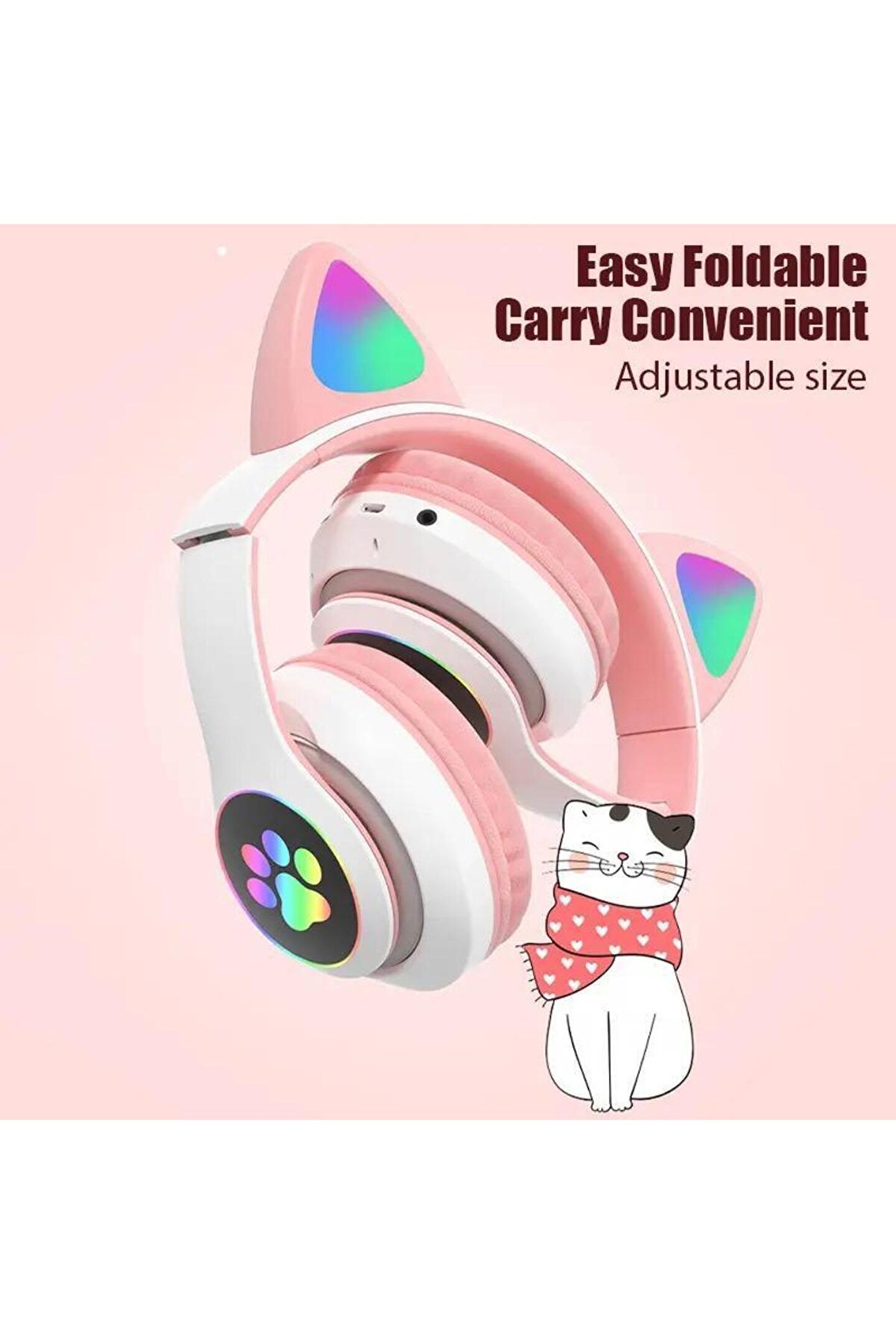 Ürün özellikleri 1. ; RGB kedi kulakları: kedi kulakları RGB ışığı yanıp sönüyor. ; Bu kulaklıklarla dünyanızı aydınlatın 2. ; Kablosuz ve kablolu ve TF kart modu: kulaklıkları cep telefonu, tablet, dizüstü bilgisayar ve bilgisayarlar gibi Bluetooth destekli cihazlarla kolayca bağlayabilirsiniz. ; Ayrıca, birlikte verilen 3.5mm Aux kablosu ile kablolu mod kullanabilir veya kullanmak için TF kartını kulaklığa ayarlayabilirsiniz. ; 3. ; Surround ses ve dahili mikrofon: hoparlör HiFi surround ses sunar. ; Mikrofon dahili ve gürültü önleyici, bu yüzden çevredeki sesleri azaltırken sesleri alabilir. ; 4. ; Katlanabilir ve taşınabilir: hem kulak pedleri içeride katlanabilir ve kafa ışını ayarlanabilir. ; Depolama için çok uygun, taşıması kolay. ; 5. ; Rahat: kulaklık light-weight.Its kulak pedleri yumuşak bellek köpük yapılmış, uzun bir süre için rahat giyen veren. ; Ürün özellikleri Renk: siyah, pembe, mor, mavi, yeşil Stil: RGB ışık kedi kulak bluetooth kulaklık Bluetooth sürümü: V5.0 + EDR Çalışma mesafesi: 10m Hoparlör: 40mm 32? Hassasiyet:-84dBm Pil kapasitesi: 200mAh (pil koruyucu kurulu ile) Çalma süresi: 3 ~ 5 saat Şarj arayüzü: USB şarj portu Şarj süresi: yaklaşık 2 saat Bekleme süresi: 200 saat Destek profili: A2DP 1.2,AVRCP 1.0,HSP,HSF 1.5 Fonksiyon: RGB renk yanıp sönen LED ışık, katlanabilir tasarım, bluetooth modu/TF kart modu/3.5mm Aux modu (3 çalışma modu), gerçek stereo HIFI bas ses, akıllı gürültü iptal, mikrofon ile Paket içeriği: 1 * kedi kulak Bluetooth kulaklık 1 * USB şarj kablosu 1 * kullanım kılavuzu;