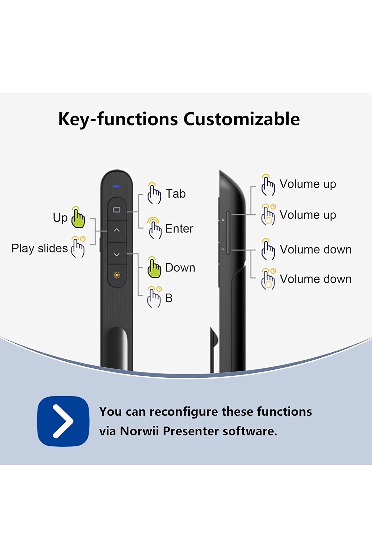 Özelleştirilebilir Anahtar fonksiyonu - Anahtarın işlevini Norwii Presnter yazılımı aracılığıyla yeniden yapılandırabilirsiniz. Özelleştirme ile, bu powerpoint tıklayıcı bireysel işlevsellik ihtiyaçlarını karşılamak için kişiselleştirilebilir ve daha geniş bir sunum yazılımı yelpazesi ile uyumludur.
