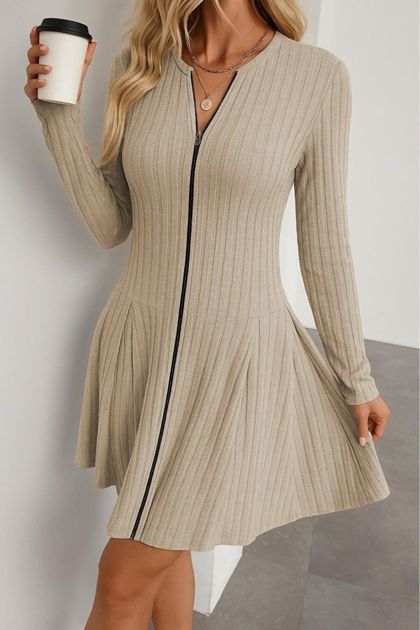 EQURİ Kadın Uzun Kollu önden Fermuarlı Pileli şardonlu Kaşkorse Mini Elbise