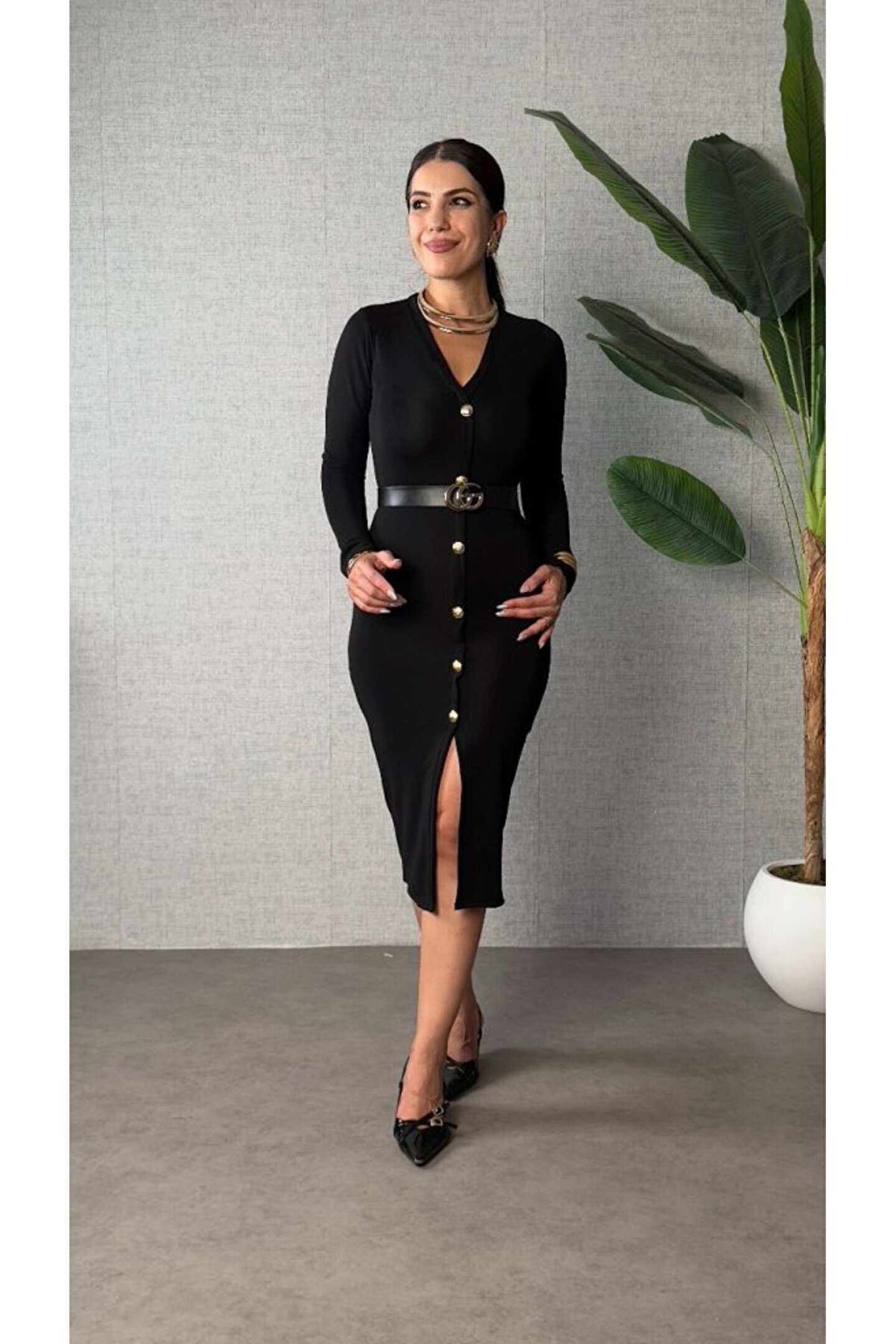 EQURİ Kadın Uzun Kollu V Yakalı önden Düğmeli Yırtmaçlı Modal Midi Kemersiz Elbise