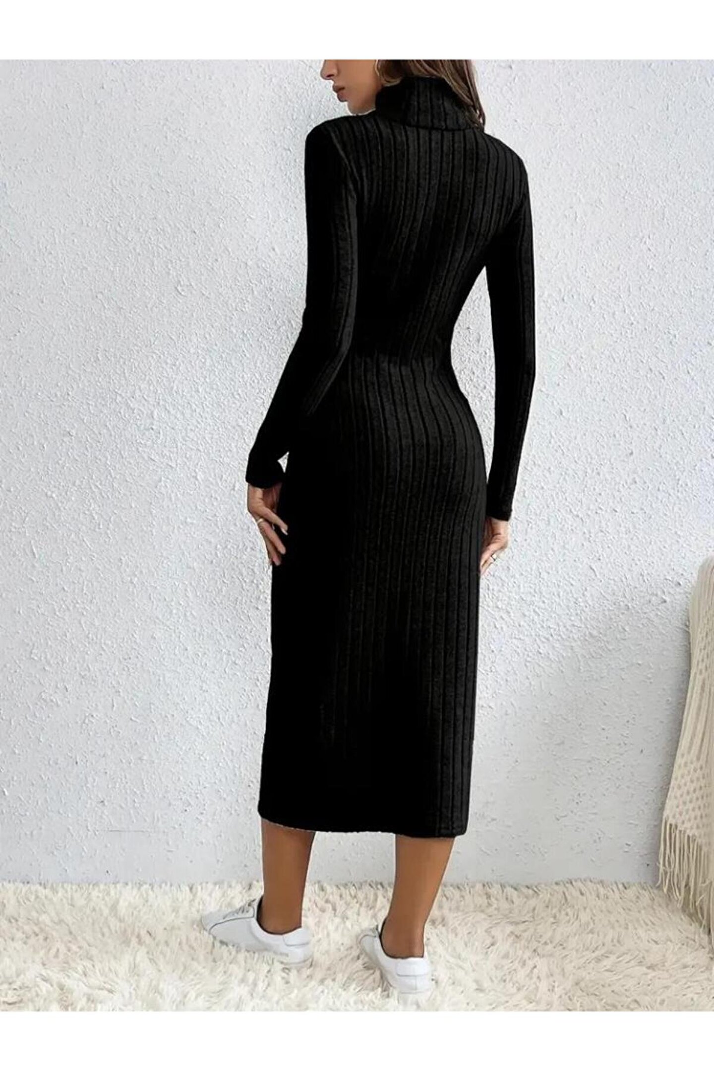 Kadın Uzun Kollu Balıkçı Yaka Yırtmaçlı Düğmeli şardonlu Kaşkorse Elbise