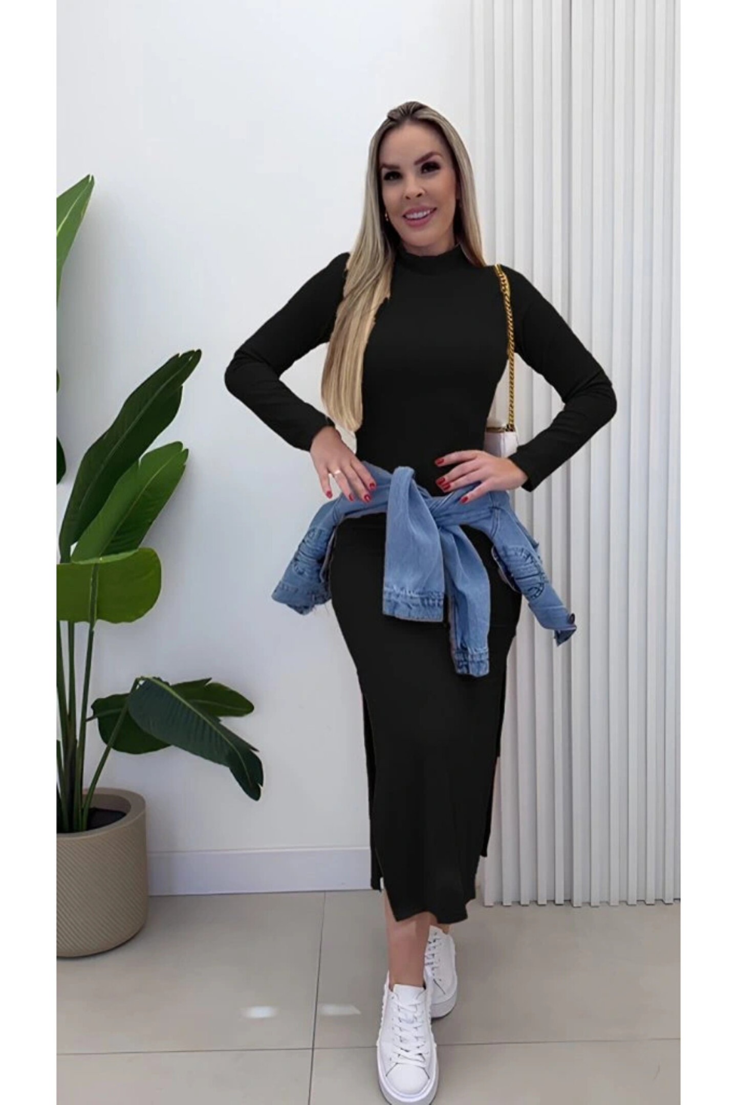 Kadın Uzun Kollu Balıkçı Yakalı Yanlardan Yırtmaçlı Kaşkorse Maxi Elbise