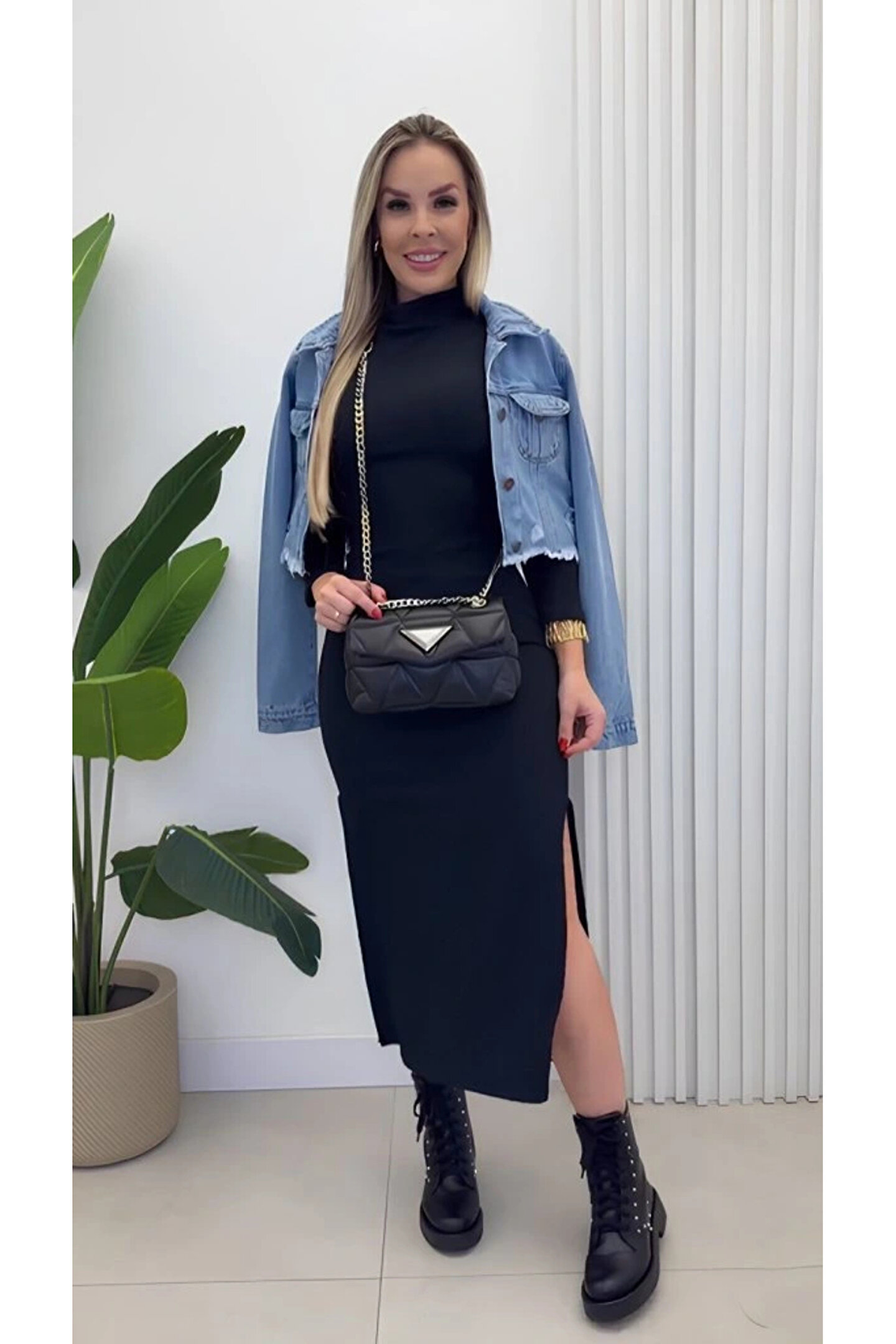 TBL DEKOR Kadın Uzun Kollu Balıkçı Yakalı Yanlardan Yırtmaçlı Kaşkorse Maxi Elbise