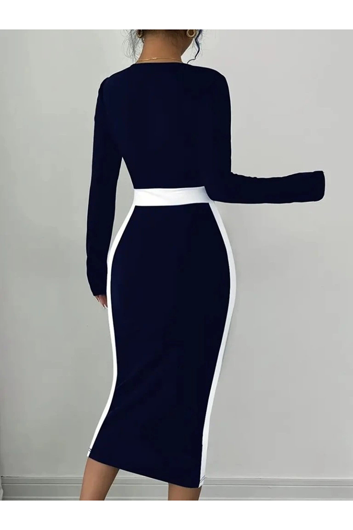 TBL DEKOR Kadın Uzun Kollu Geometrik Yaka Midi Ithal Krep Elbise
