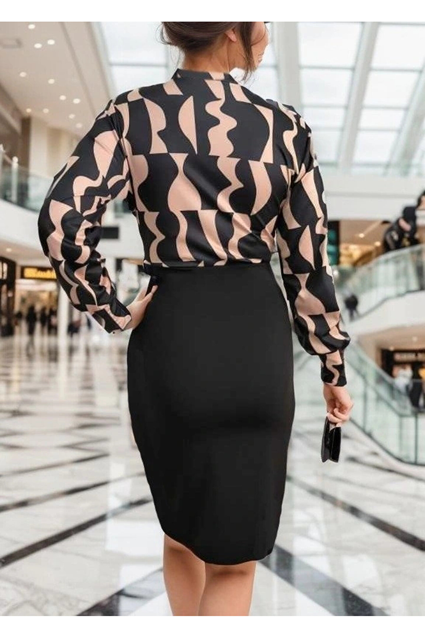 TBL DEKOR Kadın Uzun Kollu Kruvaze Yaka Dijital Baskılı Fiyonk Detay Atlas Kumaş Elbise