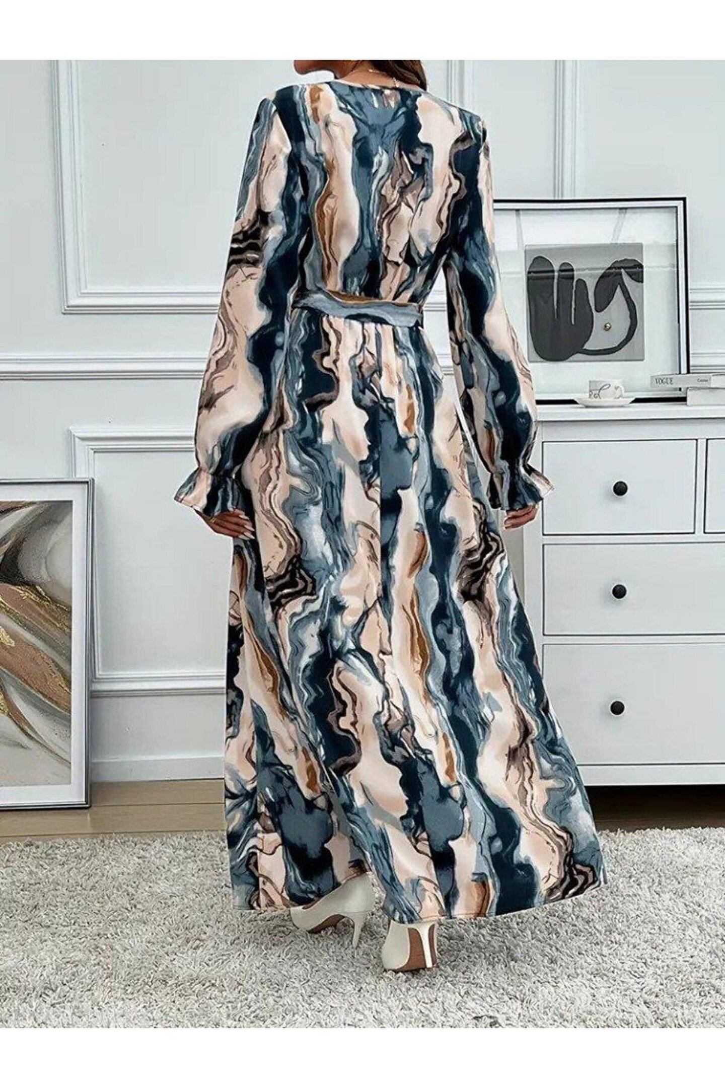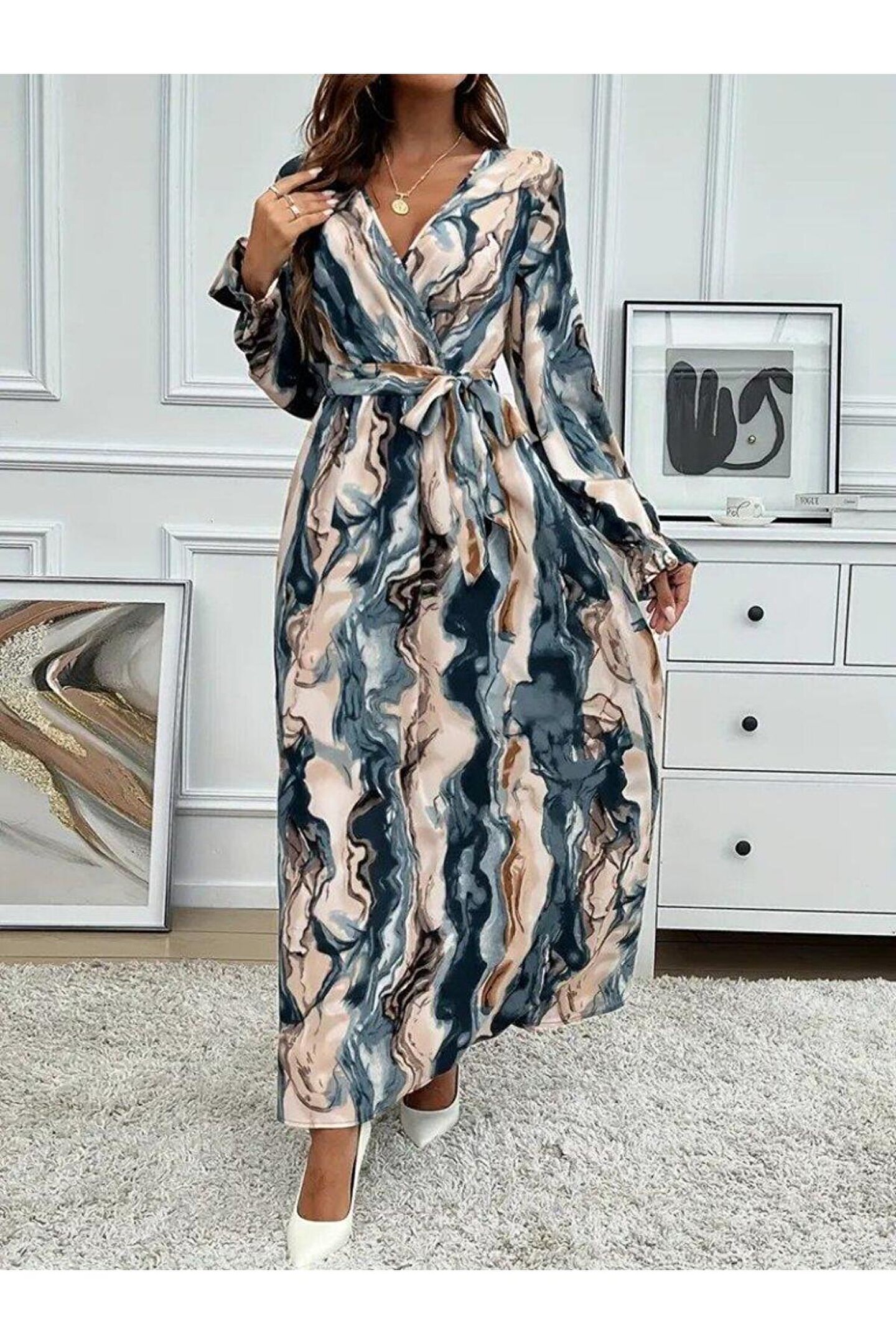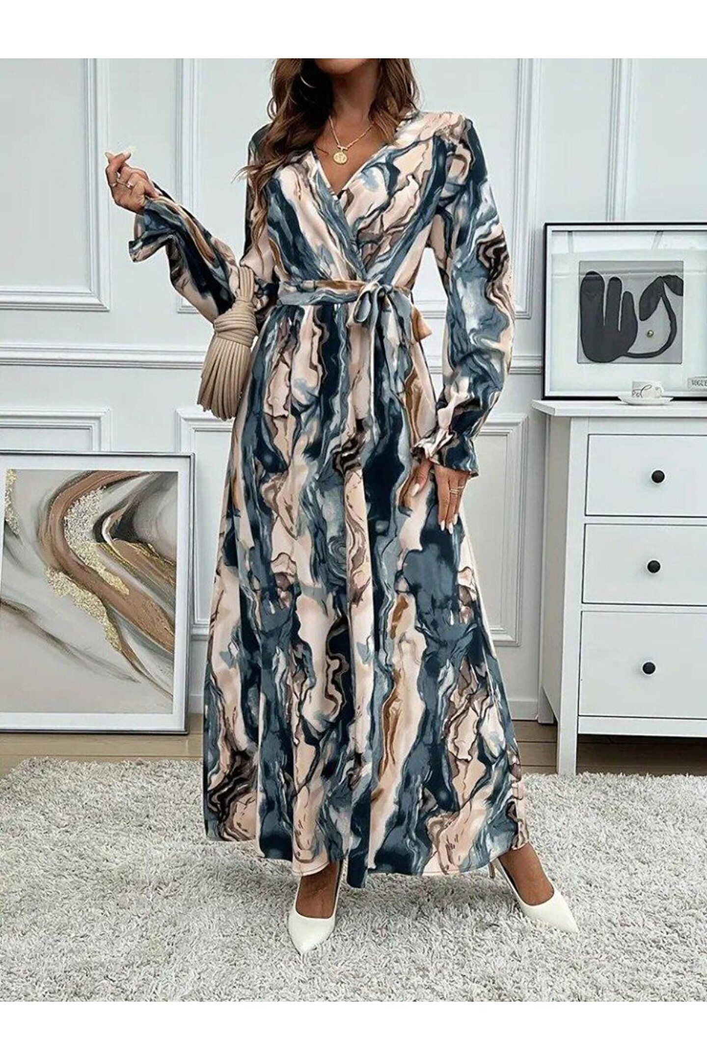 TBL DEKOR Kadın Uzun Kollu Kruvaze Yakalı Beli Kuşaklı Desenli Süprem Maxi Elbise