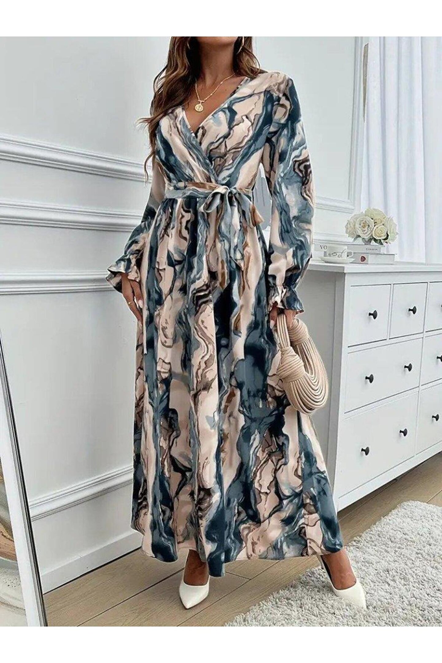 Kadın Uzun Kollu Kruvaze Yakalı Beli Kuşaklı Desenli Süprem Maxi Elbise