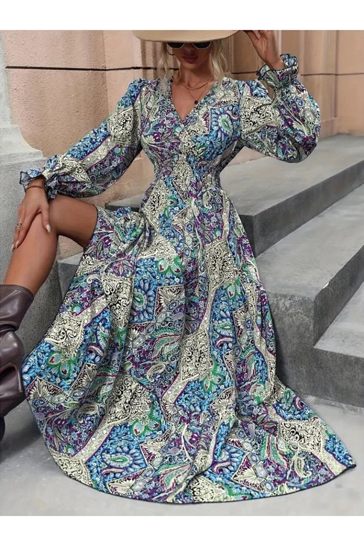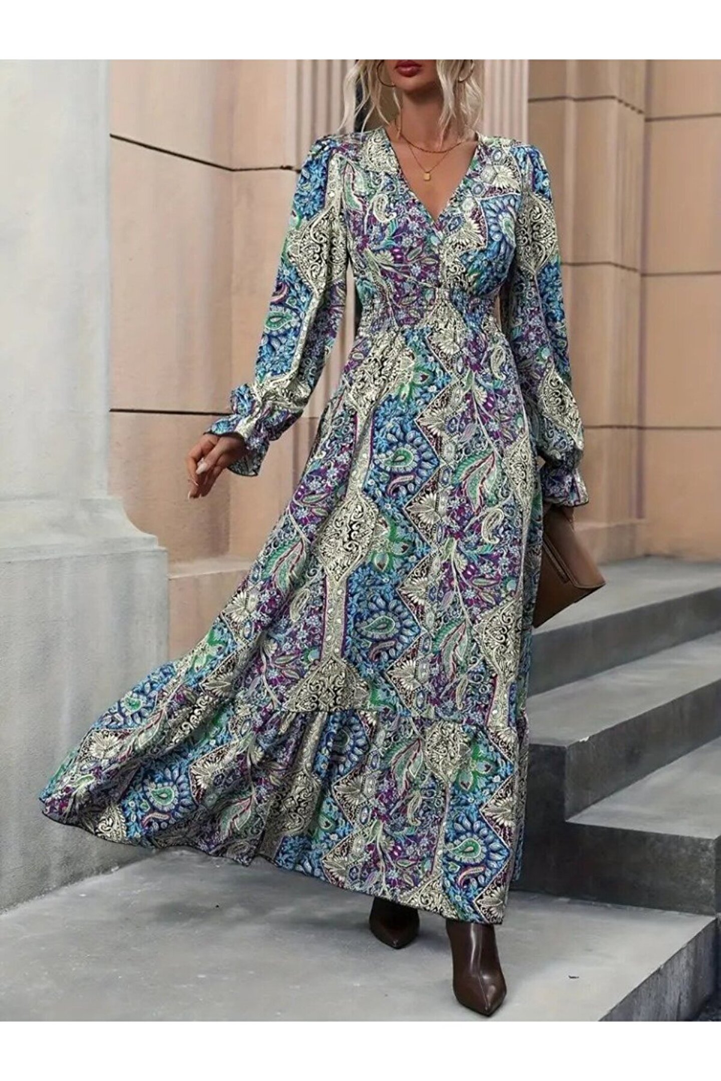 Kadın Uzun Kollu Kruvaze Yakalı Desenli Süprem Maxi Elbise