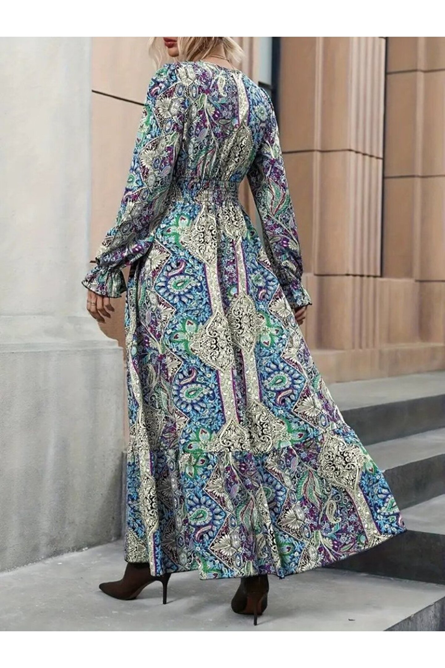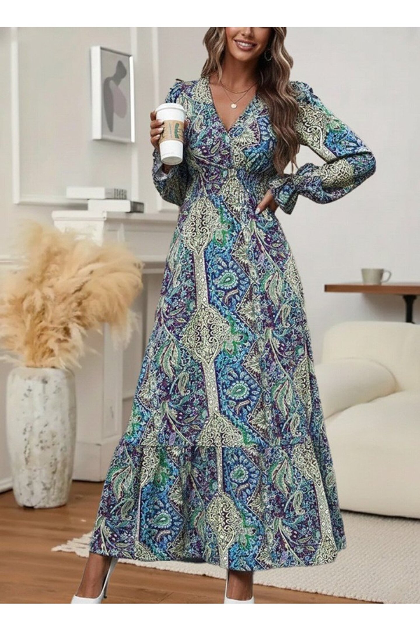 TBL DEKOR Kadın Uzun Kollu Kruvaze Yakalı Desenli Süprem Maxi Elbise
