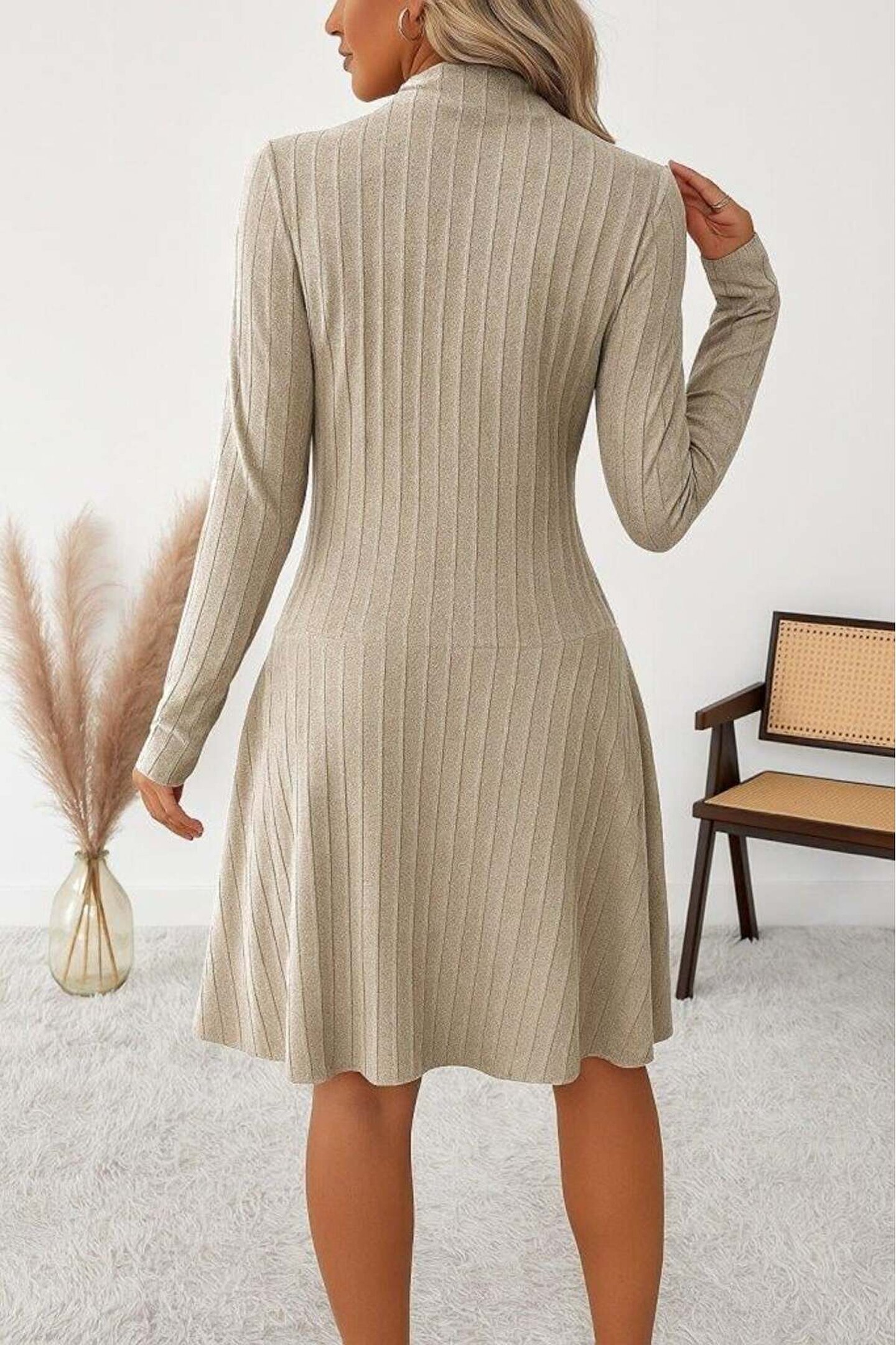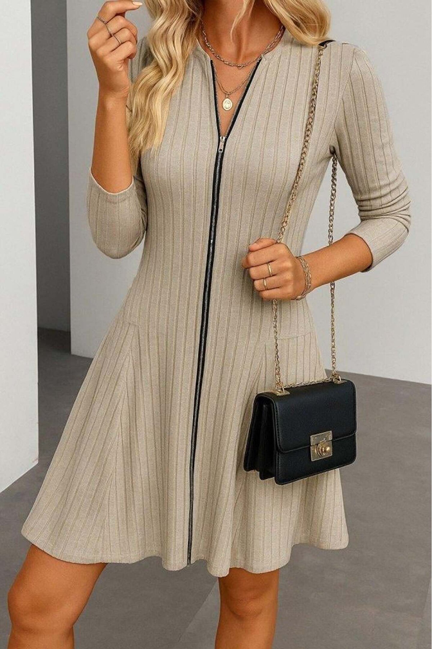Kadın Uzun Kollu önden Fermuarlı Pileli şardonlu Kaşkorse Mini Elbise