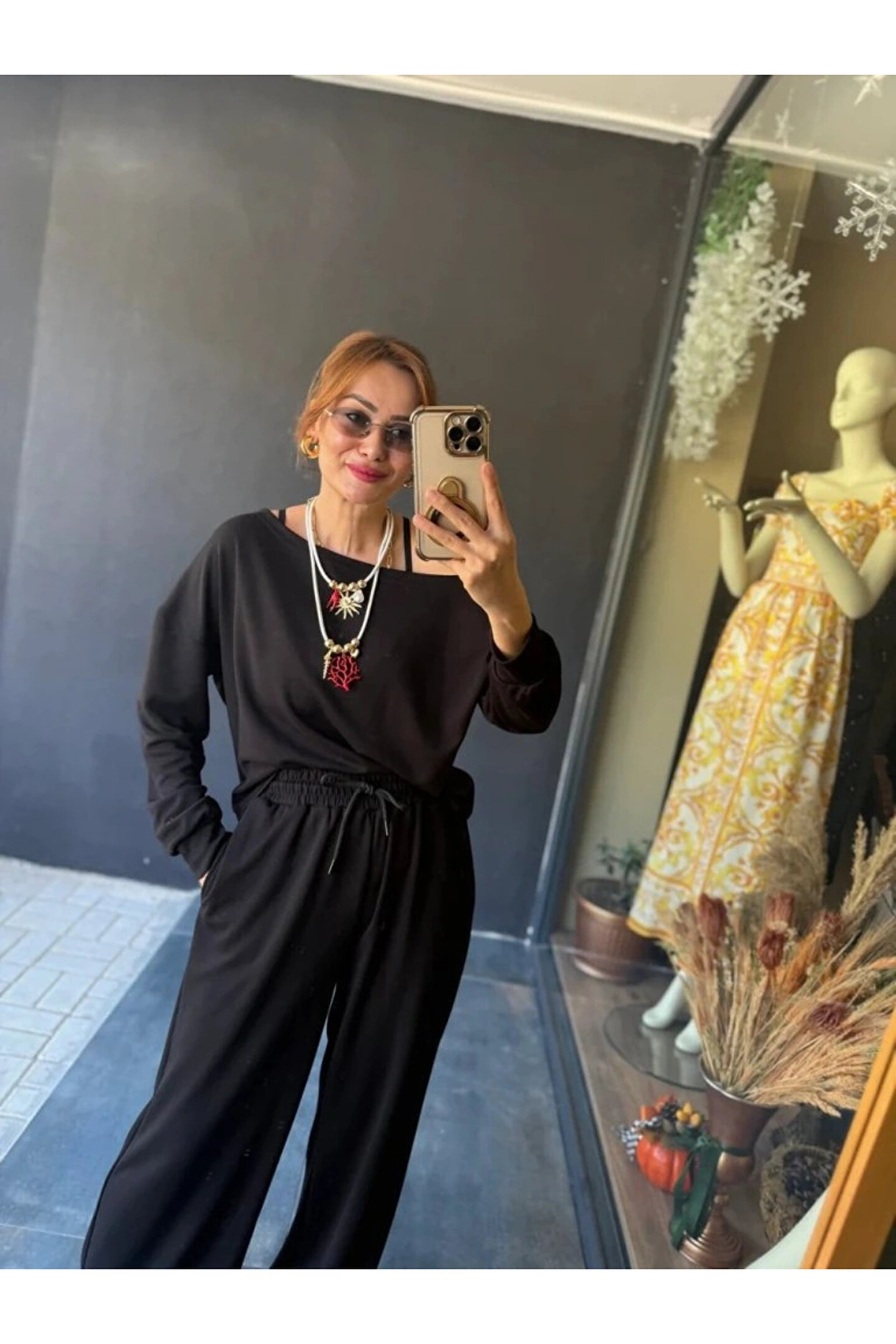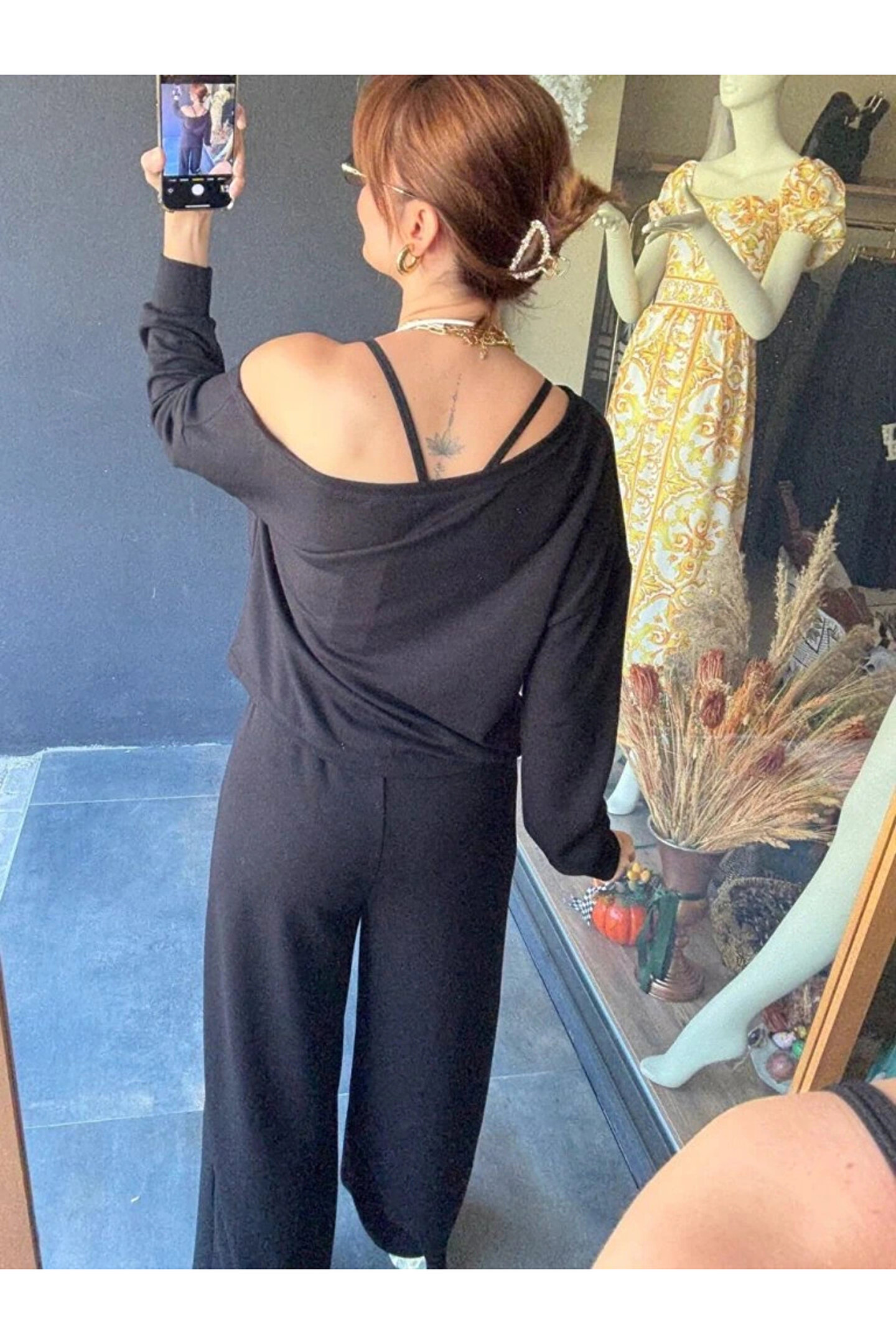 Kadın Uzun Kollu Tek Omuzdan Açık Viskon Iki Iplik Bluz Ve Pantolon Ikili Takım