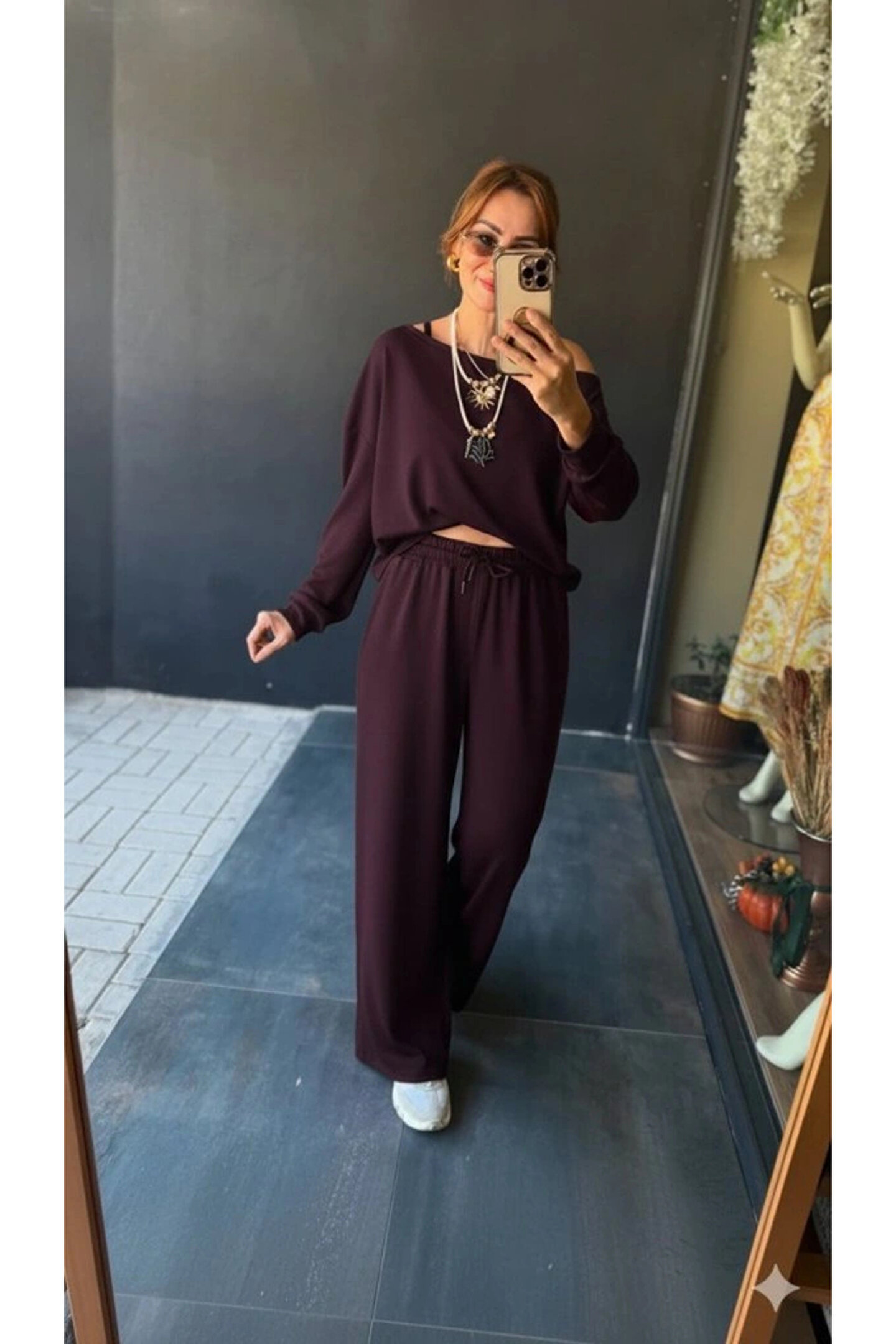Kadın Uzun Kollu Tek Omuzdan Açık Viskon Iki Iplik Bluz Ve Pantolon Ikili Takım