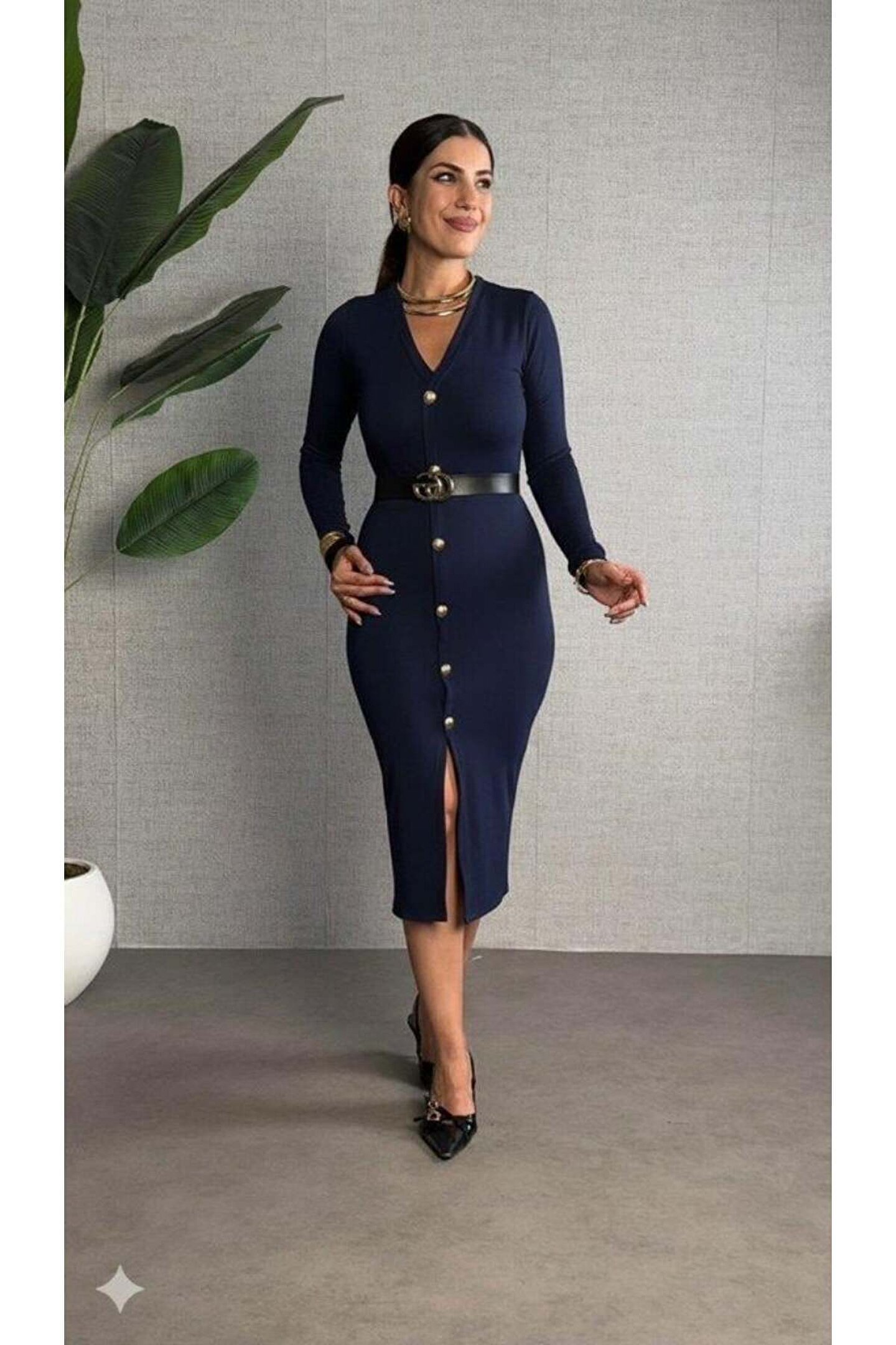 Kadın Uzun Kollu V Yakalı önden Düğmeli Yırtmaçlı Modal Midi Kemersiz Elbise