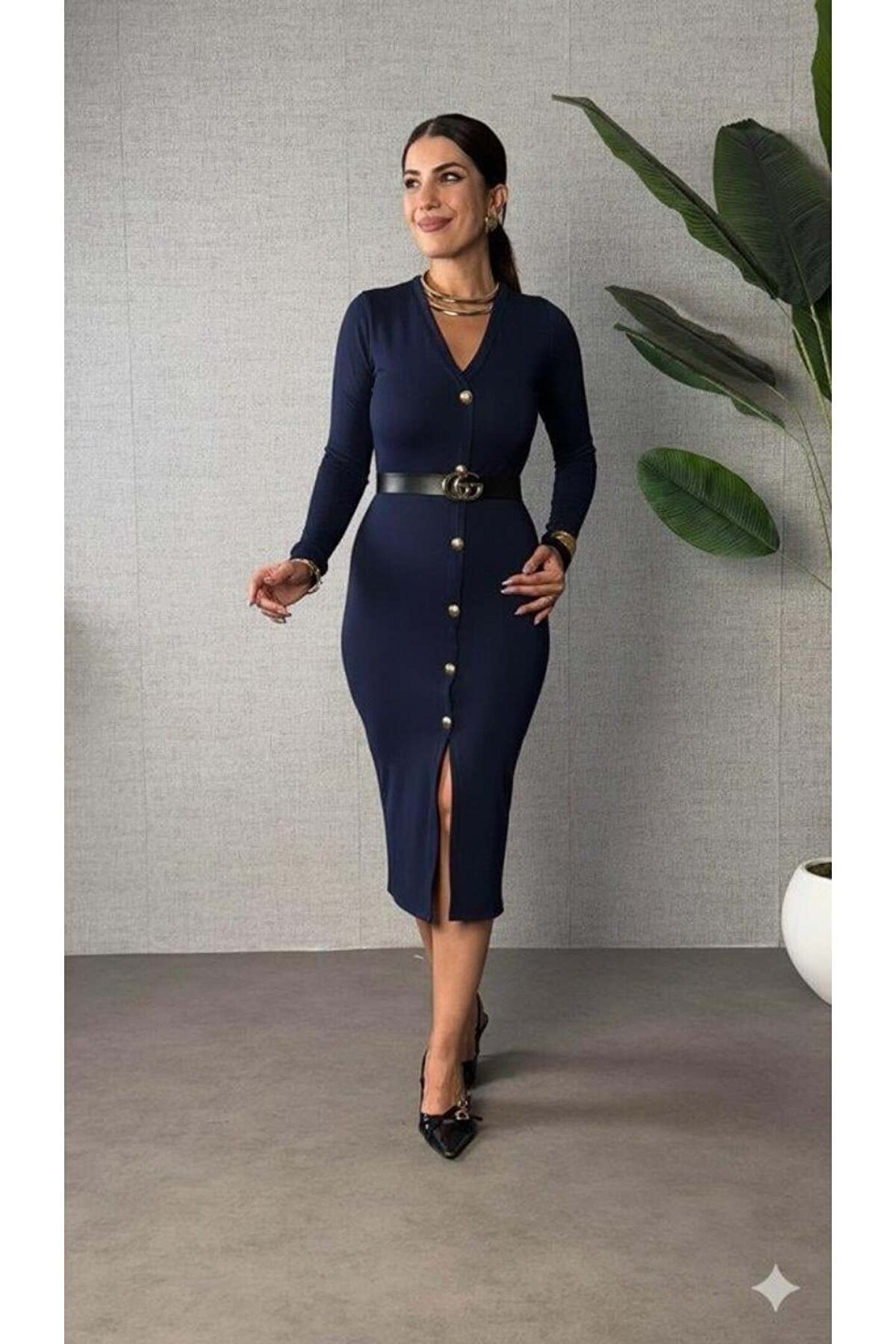 Kadın Uzun Kollu V Yakalı önden Düğmeli Yırtmaçlı Modal Midi Kemersiz Elbise