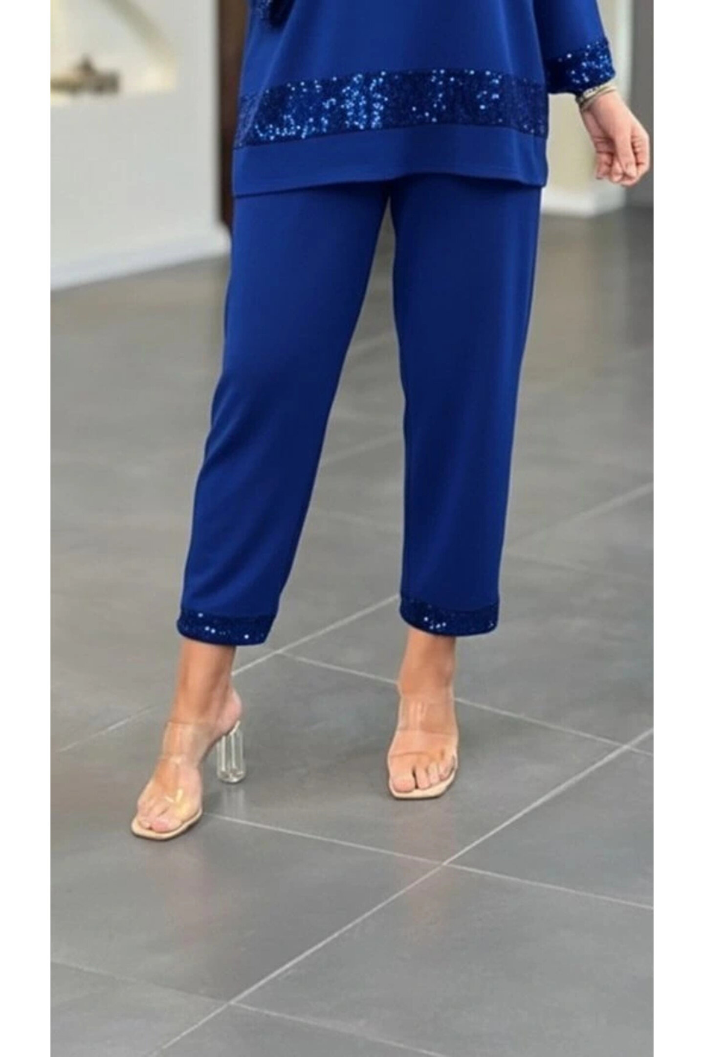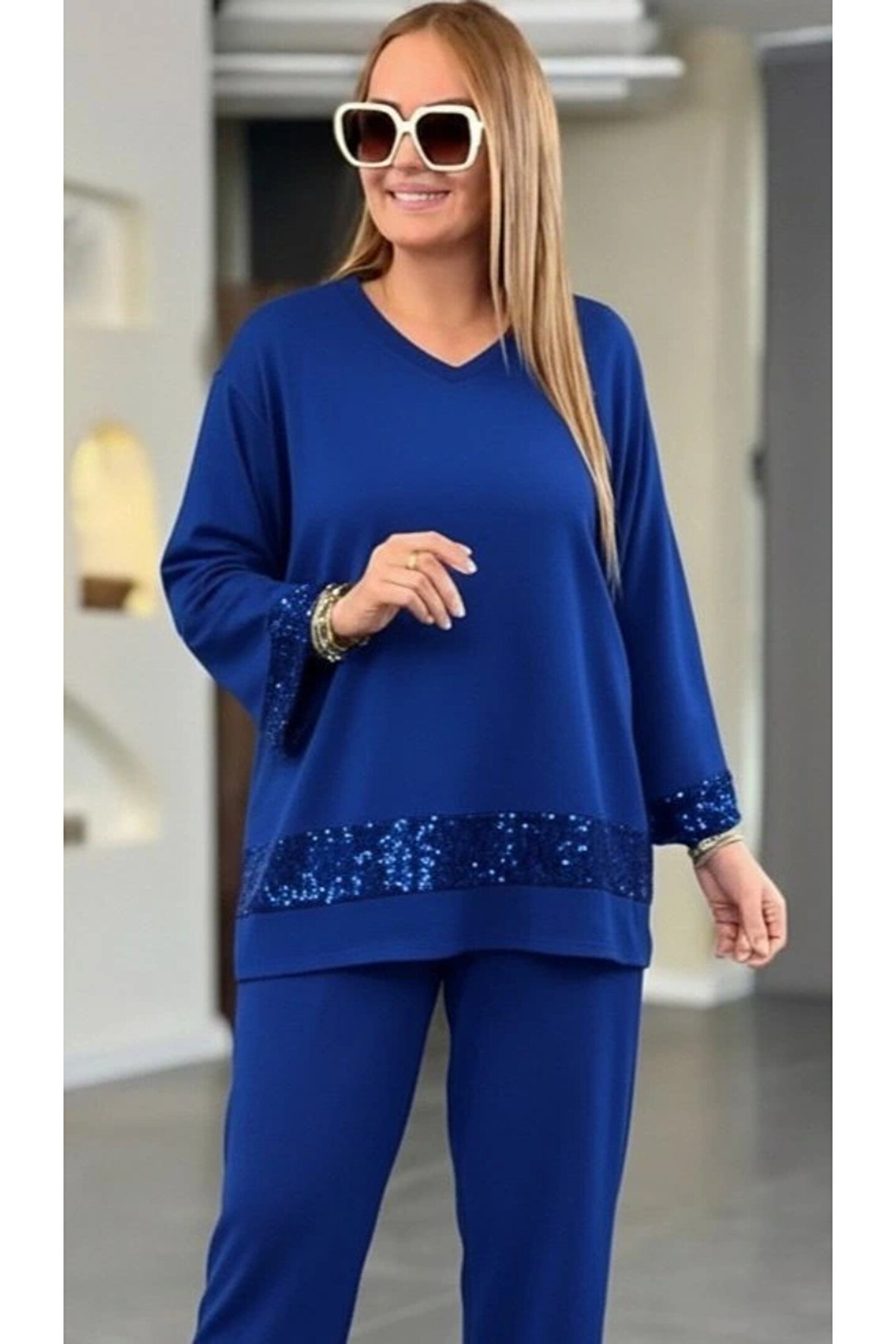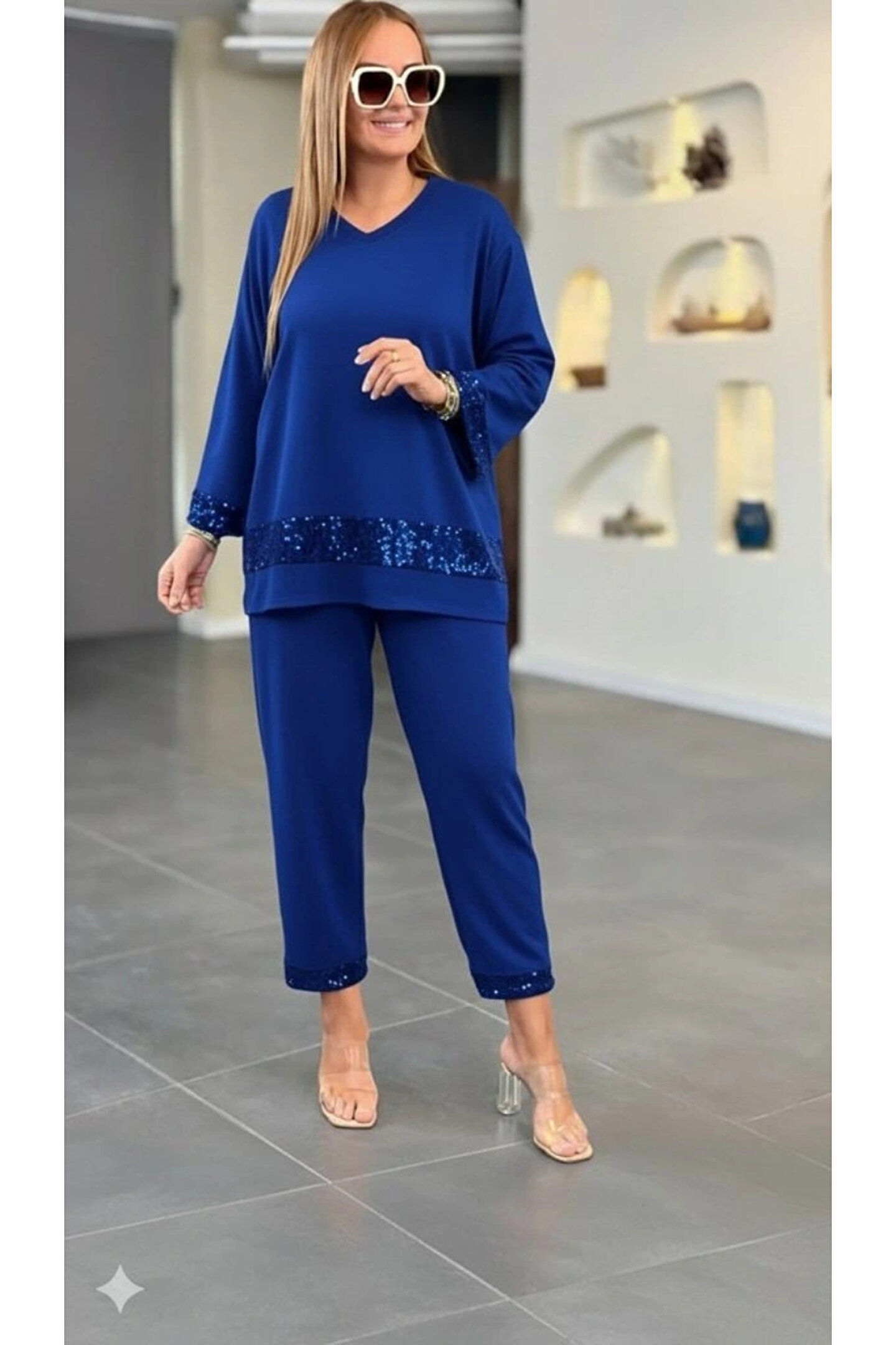 Kadın Uzun Kollu V Yakalı Pulpayet Viskon Iki Iplik Bluz Ve Pantolon Takım