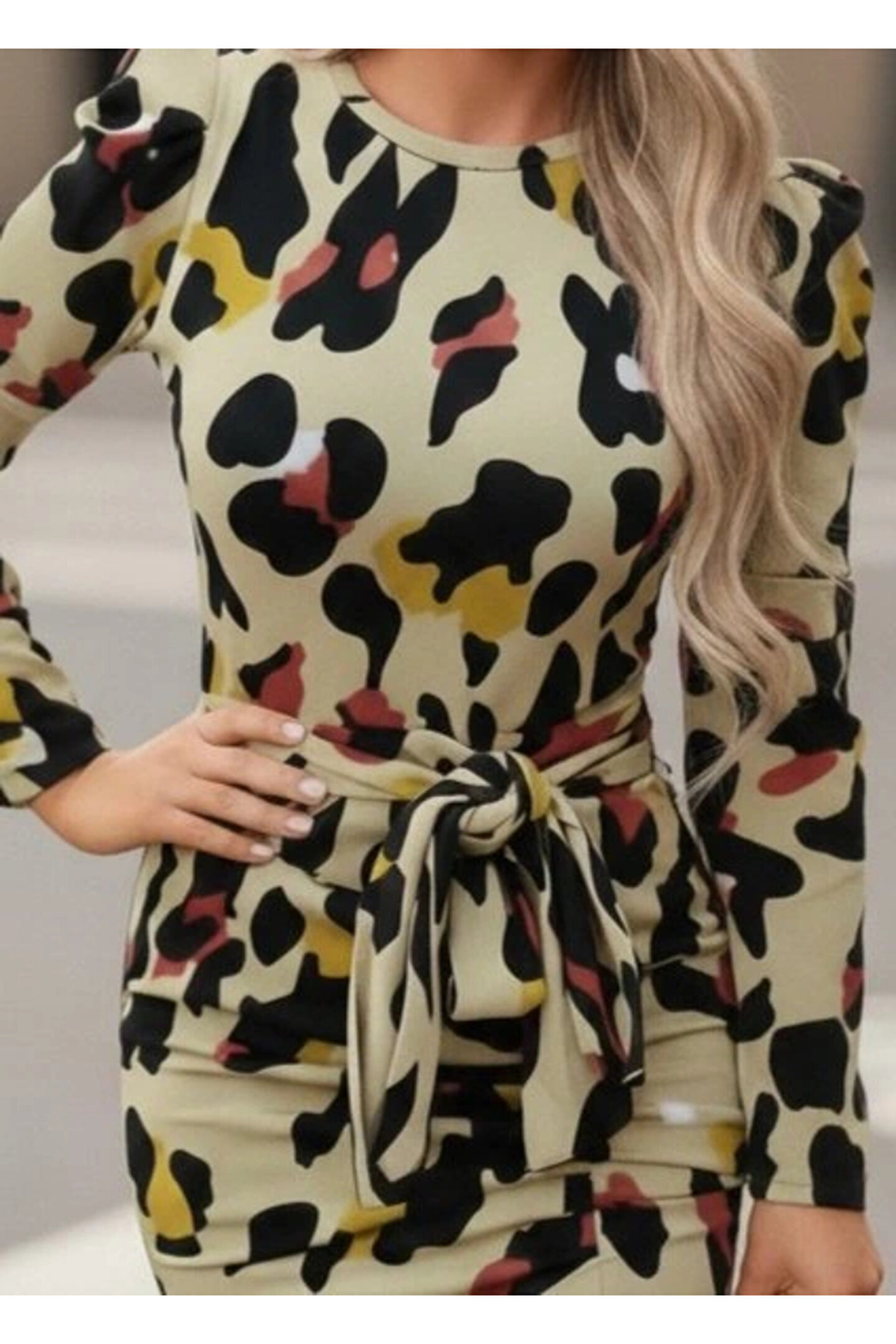 TBL DEKOR Kadın Uzun Kollu Yuvarlak Yaka Belden Kuşaklı önden Yırtmaçlı örme Krep Elbise