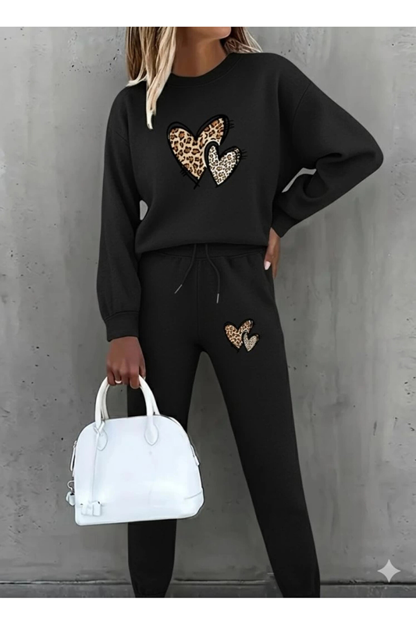 MDB Kadın Uzun Kollu Bisiklet Yaka Kalp Desenli şardonlu üç Iplik Bluz Ve Pantolon Ikili Takım