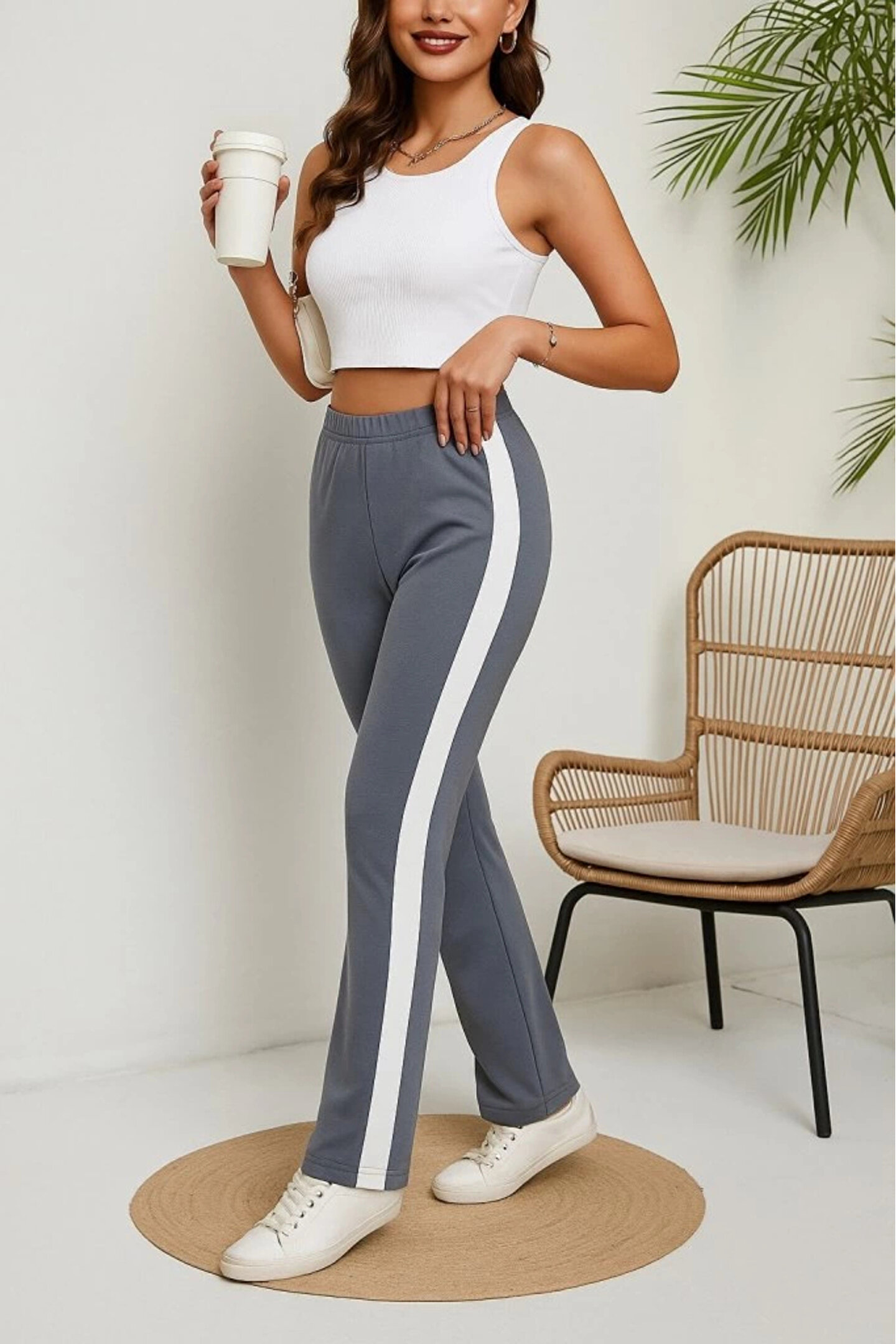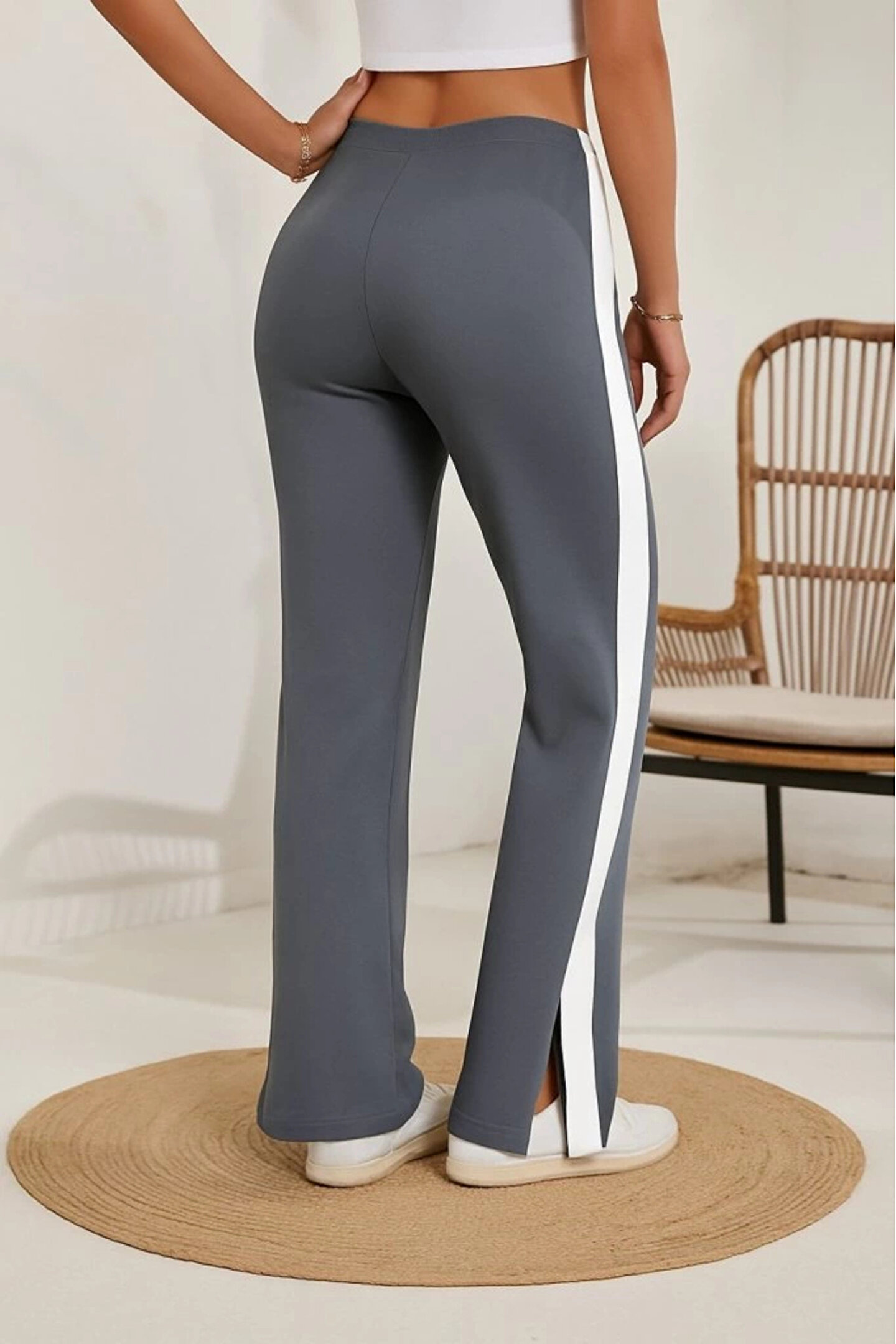 Kadın Yüksek Bel Yan şerit Detaylı Yırtmaçlı Viskon Iki Iplik Pantolon