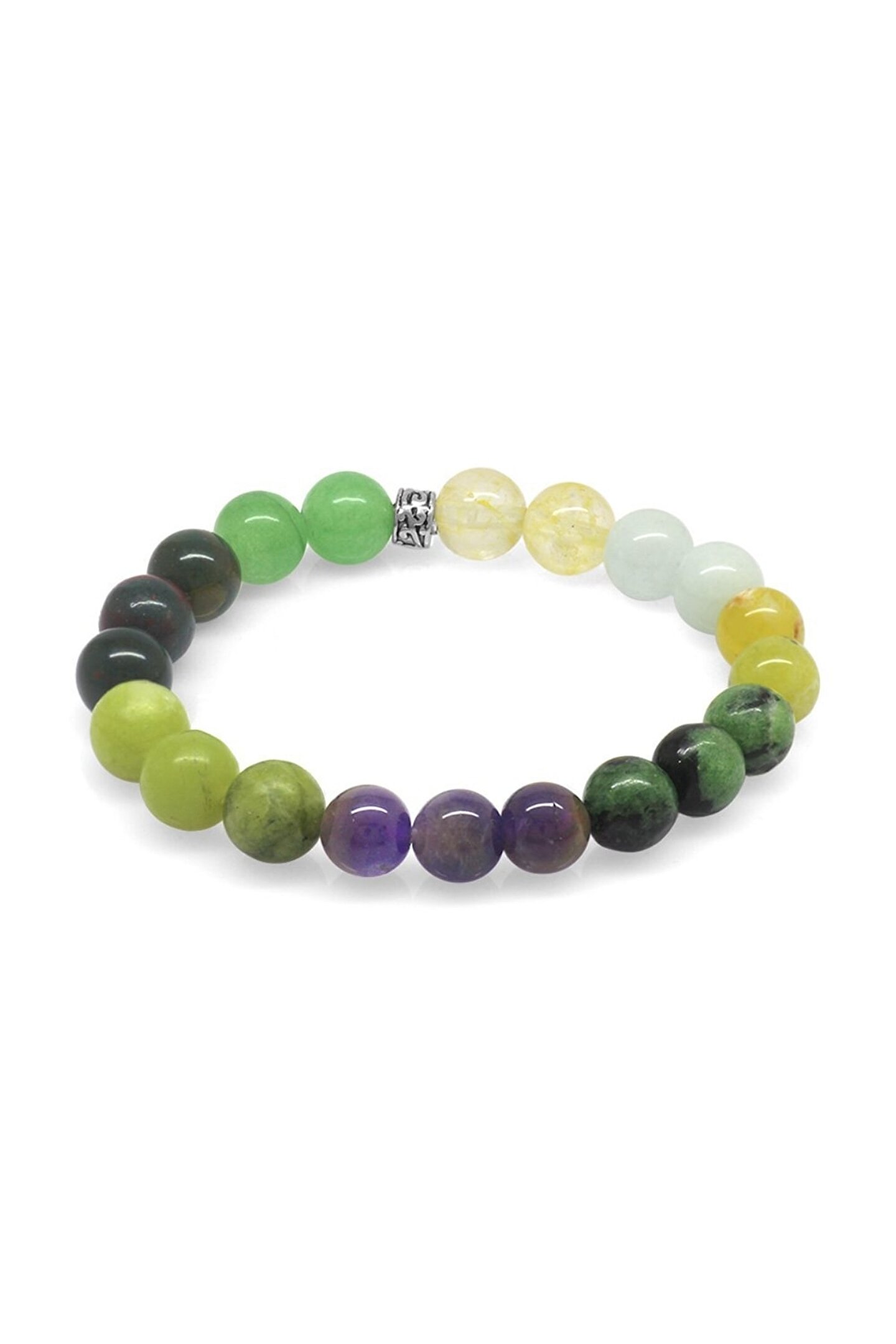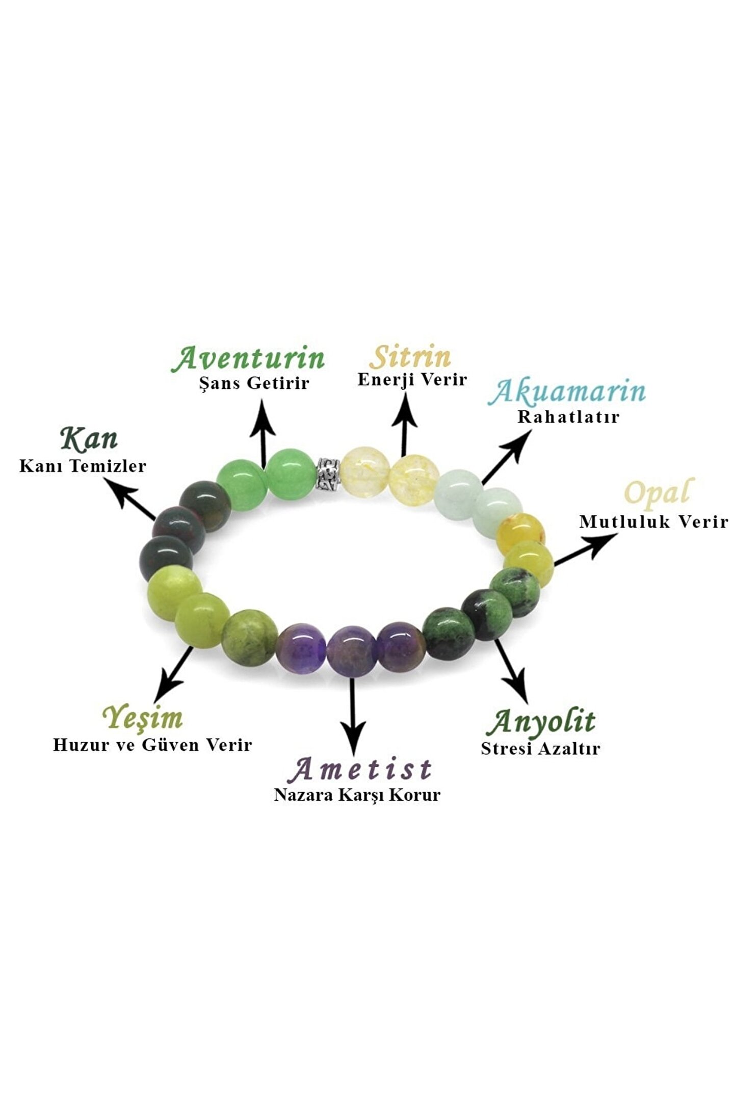 Doğal taşların eşsiz güzelliğini bileğinizde hissedin: Bu şifa bilekliği, doğanın sunduğu benzersiz ve otantik taşlarla süslenmiştir; Küre kesim tasarımıyla dikkat çeken bu bileklik, klasik ve modern çizgileri bir arada sunar; Çoklu doğaltaş kombinasyonu sayesinde her bilek boyutuna uyum sağlar ve şıklığınızı tamamlar; Gümüş rengi ile zarif bir görünüm kazandırarak, günlük kullanım için idealdir; Şifa bilekliği olarak tasarlanmış olup, enerjiyi dengelemek ve pozitif enerjiyi kanalize etmek için mükemmel bir aksesuardır;