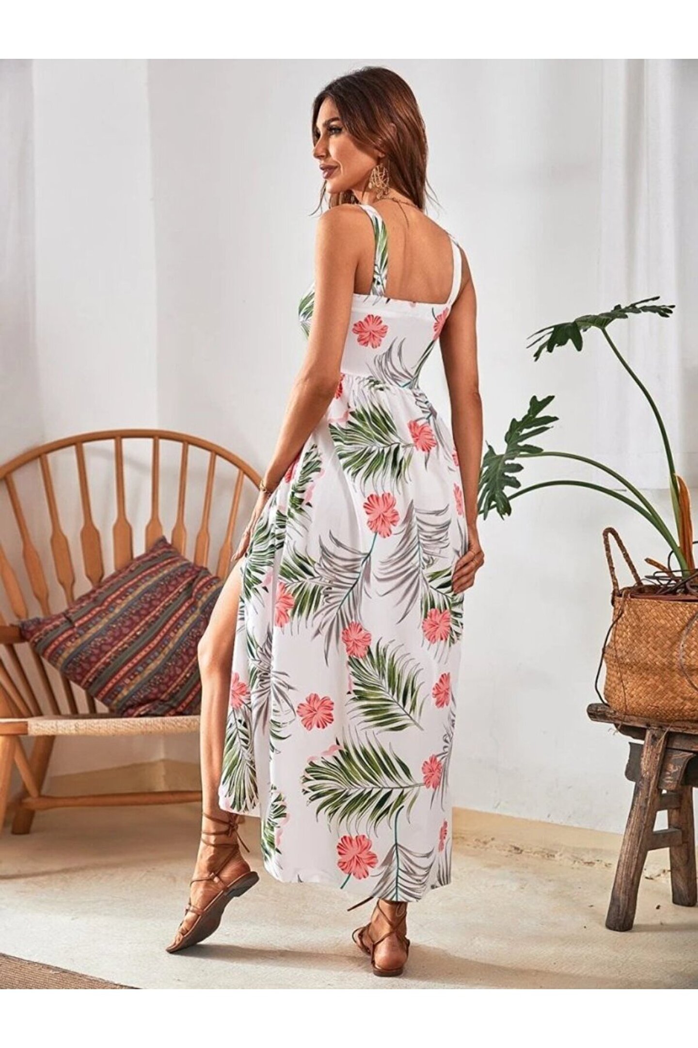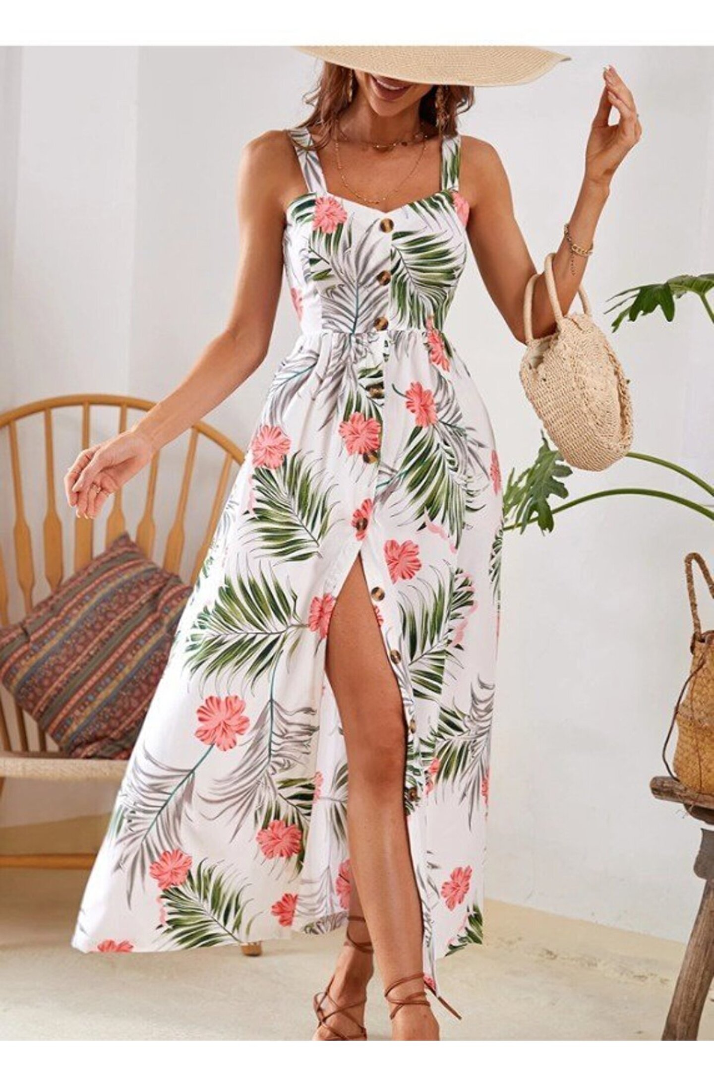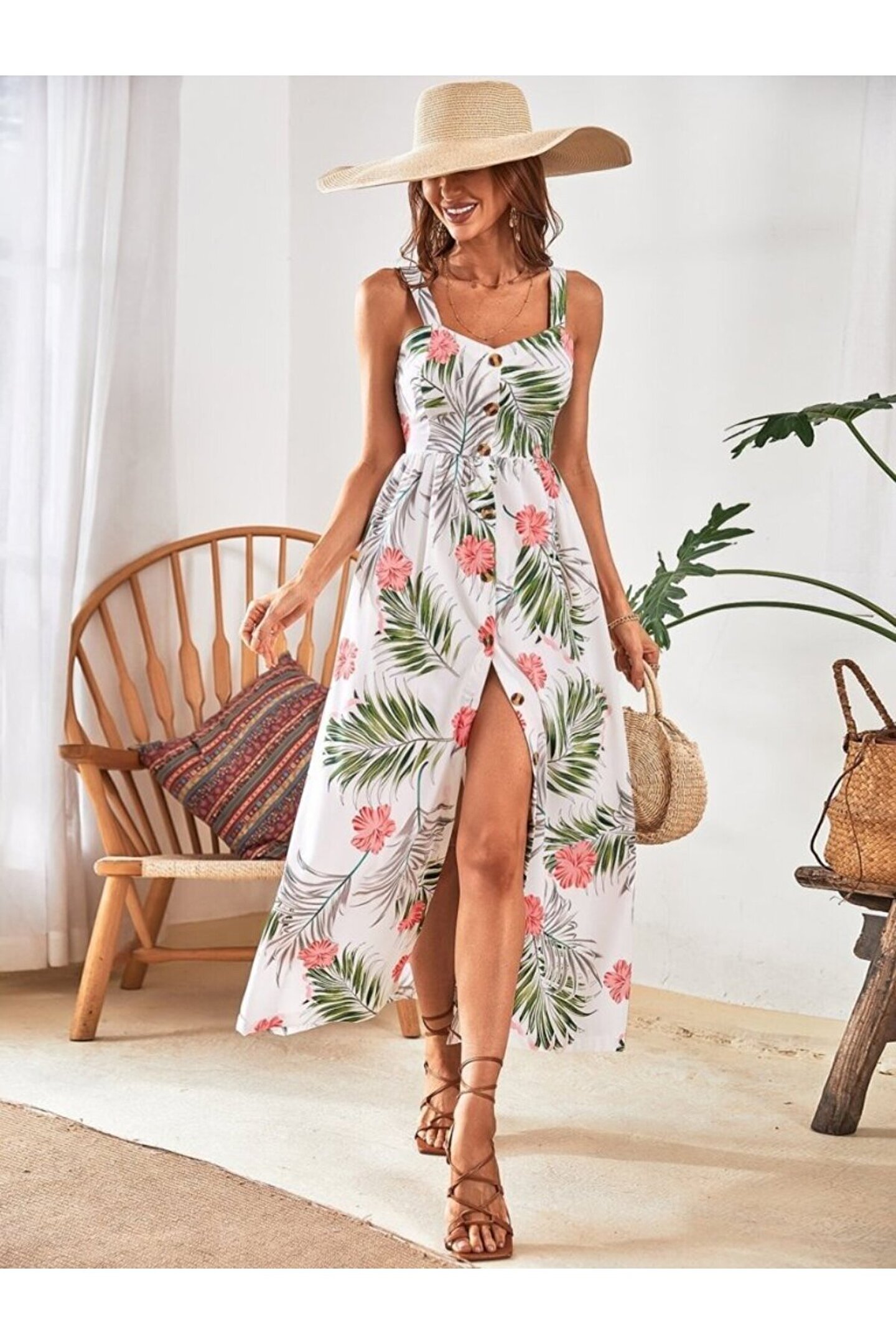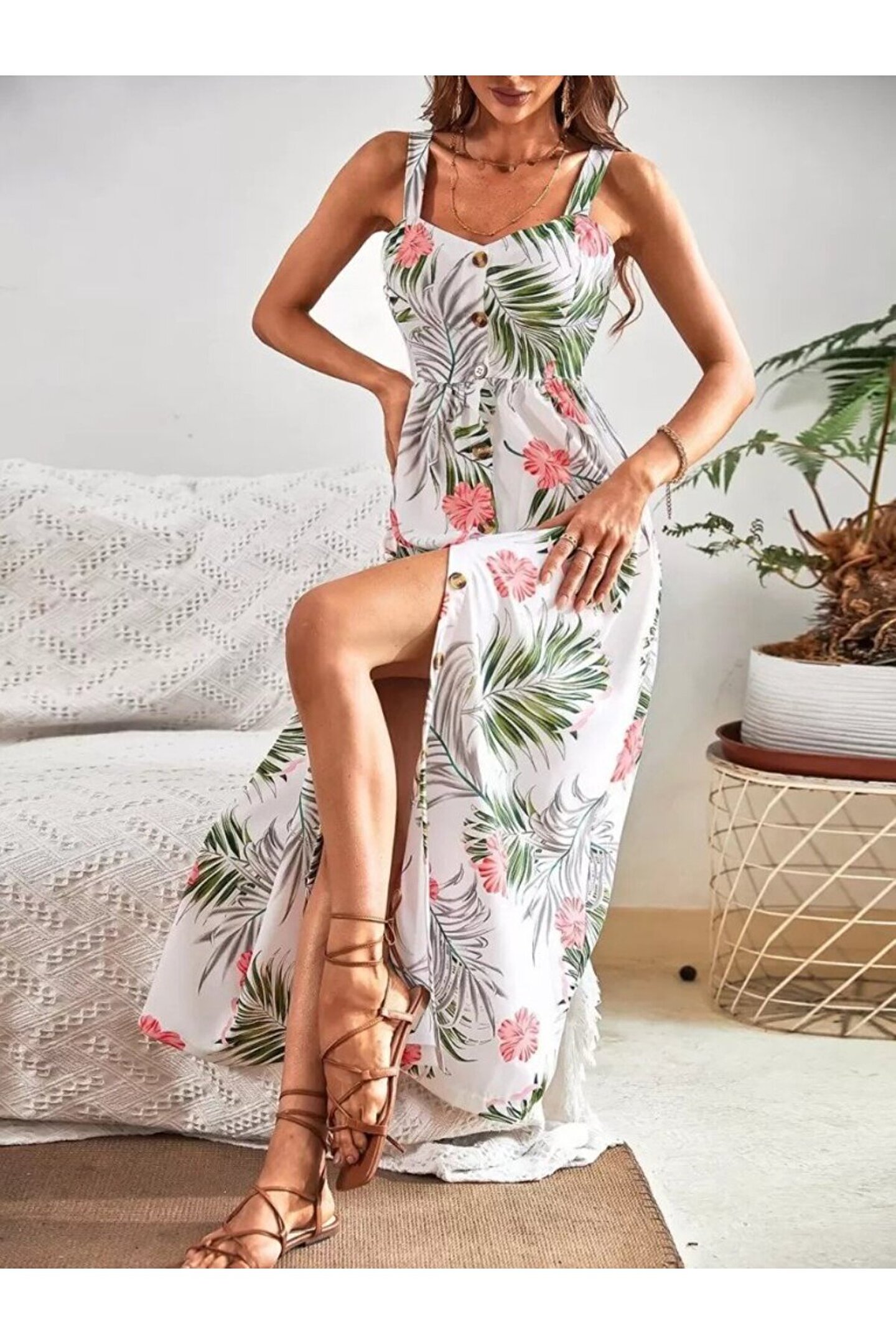 Tex Nova Kadın Askılı önden Düğmeli Yaprak Desenli Uzun Süprem Elbise