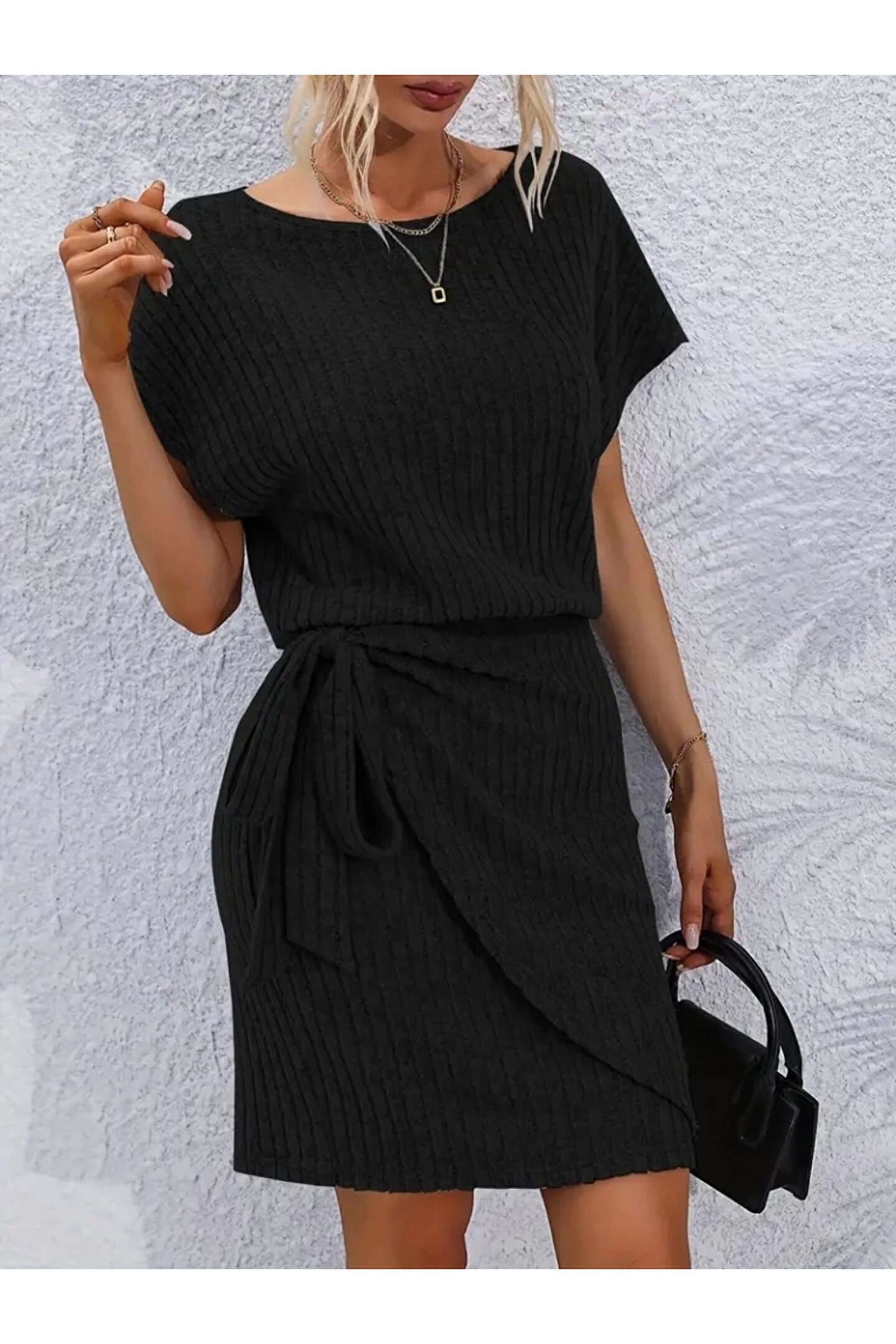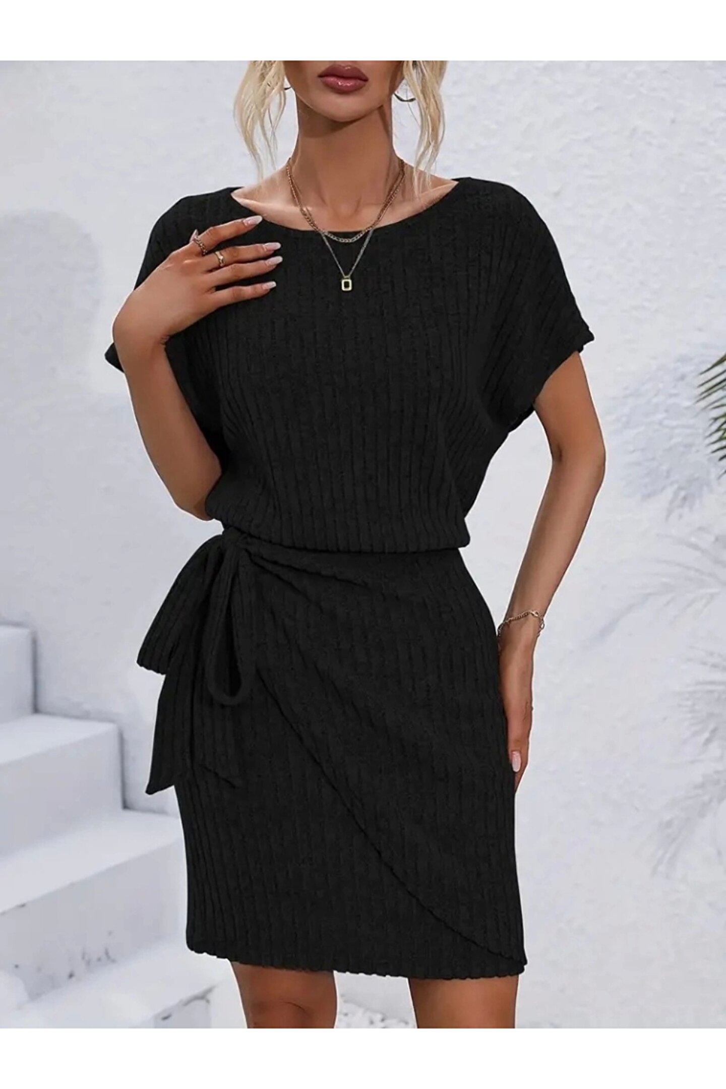 TİANA Kadın Kısa Kollu Yakası Açık Belden Lastikli Yandan Bağlamalı Kalın Fitilli Kaşkorse Elbise