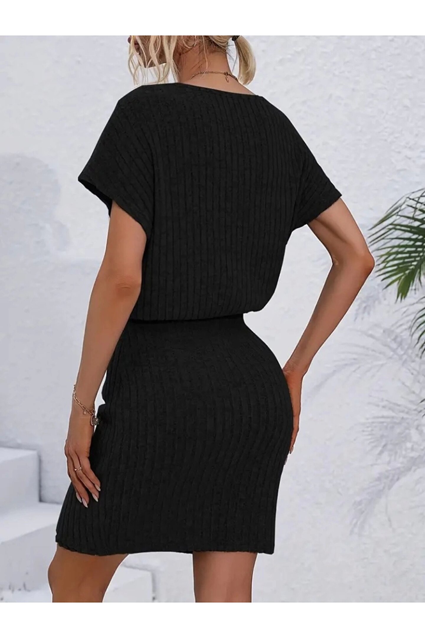 Kadın Kısa Kollu Yakası Açık Belden Lastikli Yandan Bağlamalı Kalın Fitilli Kaşkorse Elbise