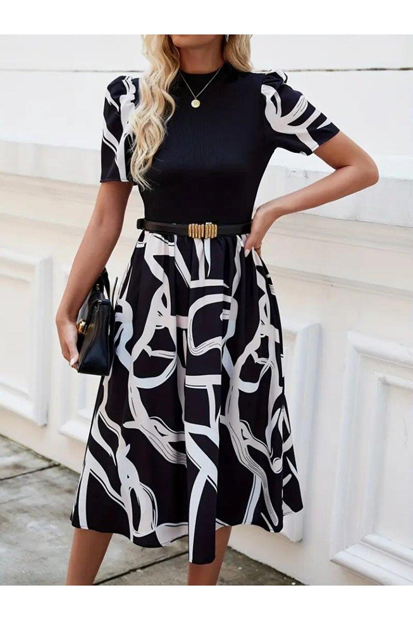 Kadın Kısa Kollu Yarı Balıkçı Yaka üst Viskon Alt Desenli Dokuma Midi Elbise