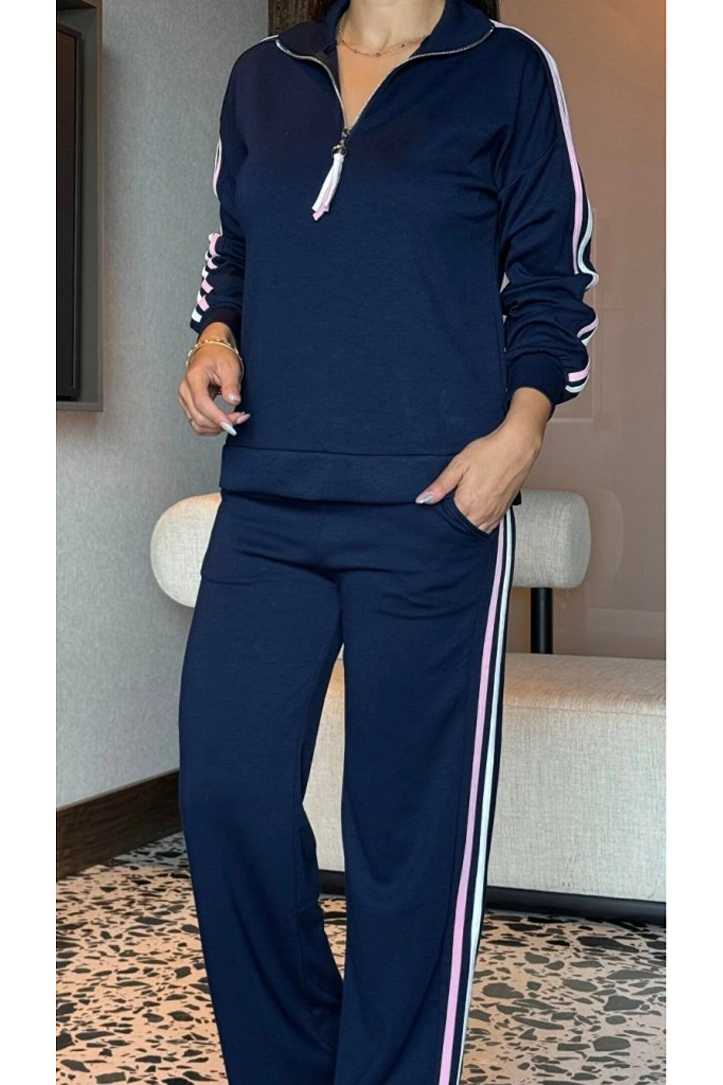 Kadın Uzun Kollu Fermuarlı Viskon Iki Iplik Bluz Ve Pantolon Ikili Takım