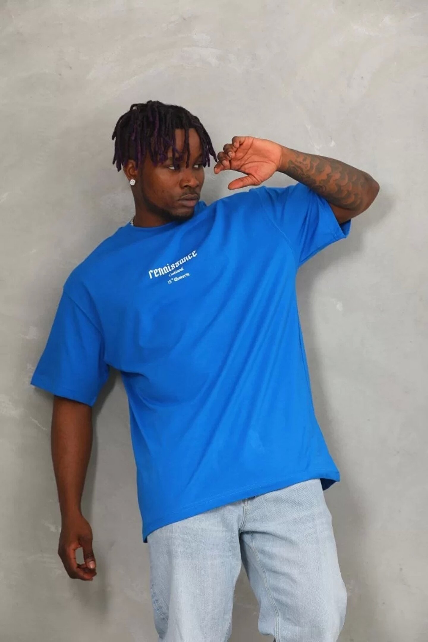 Unisex Oversize Baskılı Bisiklet Yaka T-Shirt - Mavi