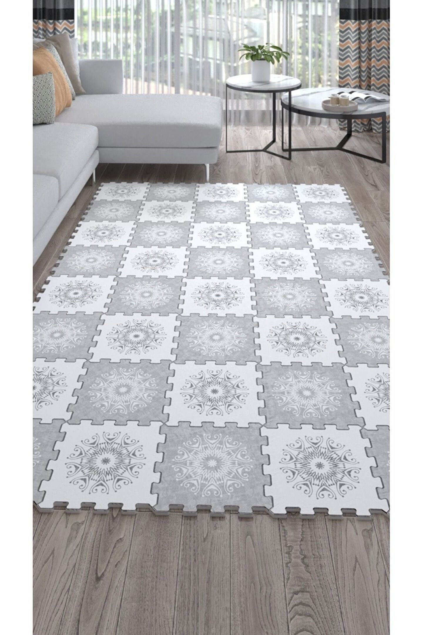 Tokyo Halı Gri Beyaz Desenli Yumuşak Salon Halısı Ths12 | Yapboz Halı | Puzzle Halı