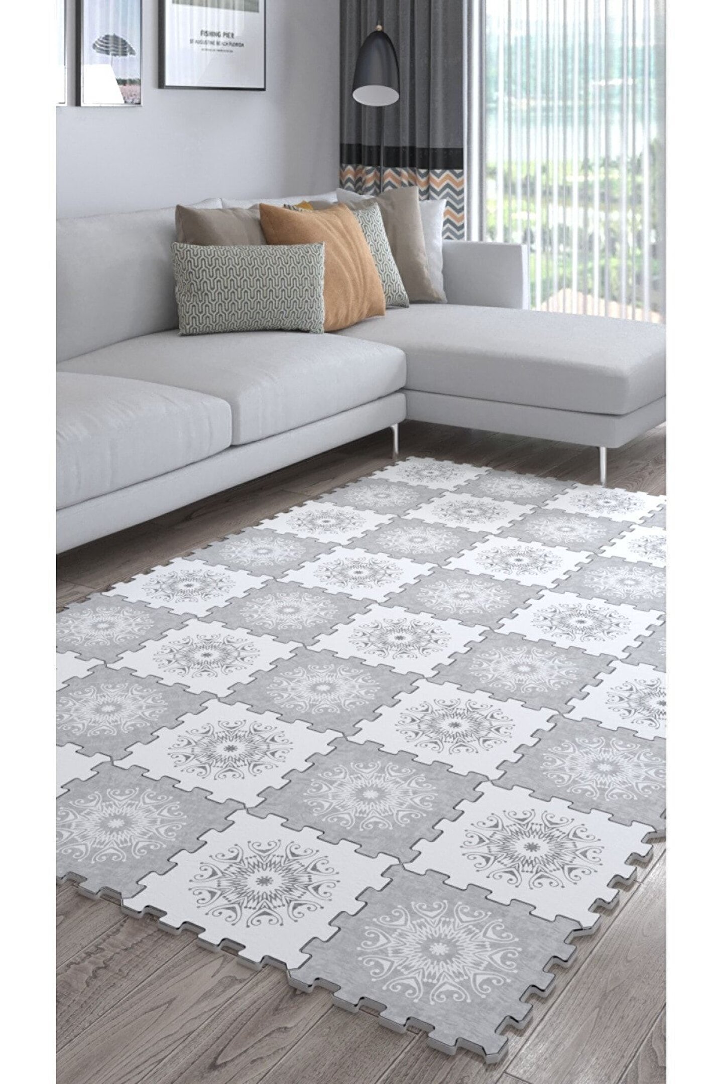 Tokyo Halı Gri Beyaz Desenli Yumuşak Salon Halısı Ths12 | Yapboz Halı | Puzzle Halı
