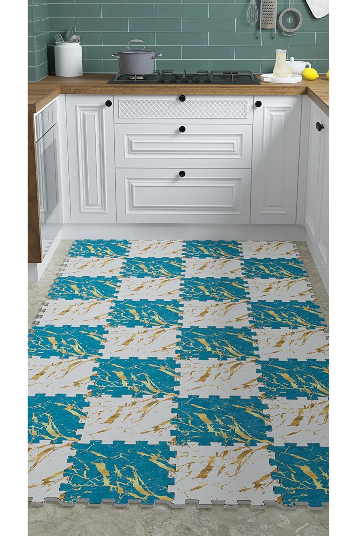 Tokyo Halı Mavi Beyaz Mermer Desenli Mutfak Halısı Thm27 | Yapboz Halı | Puzzle Halı