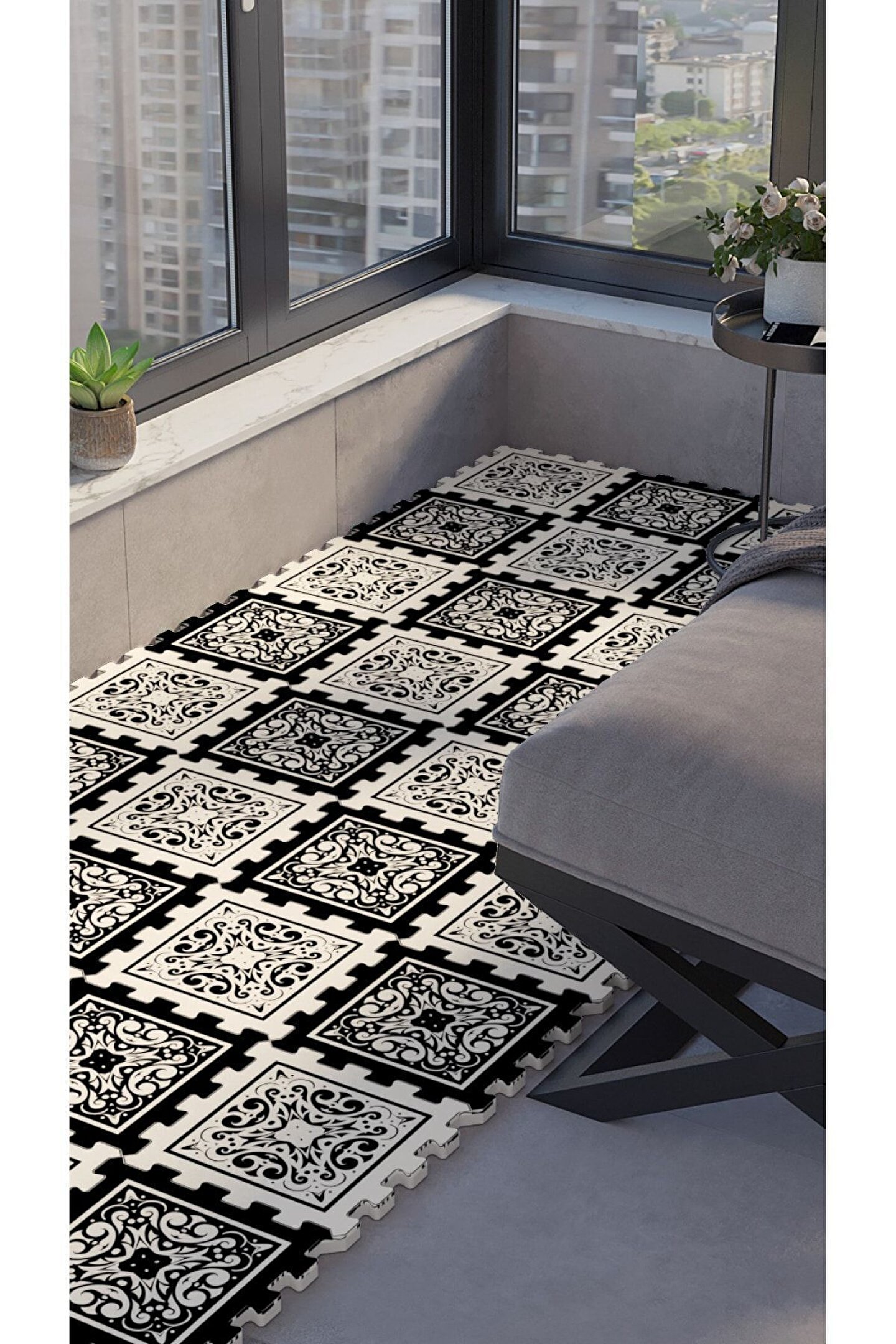 Tokyo Halı Siyah Beyaz Desenli Yıkanabilir Balkon Halıs Thb13 | Yapboz Halı | Puzzle Halı