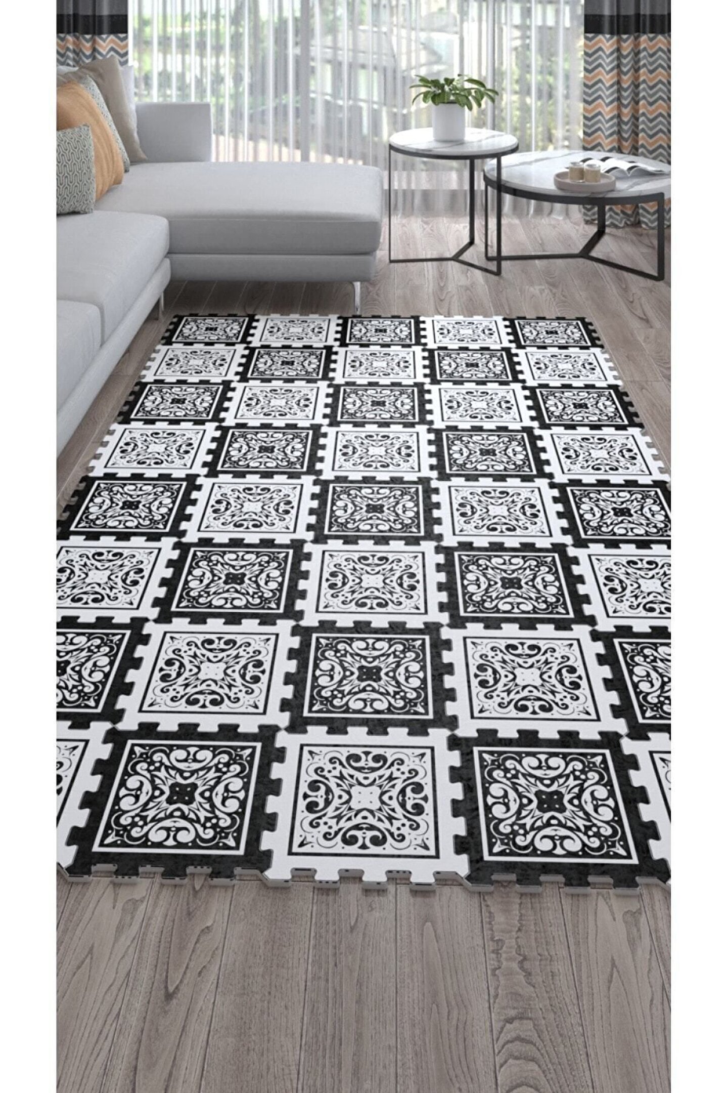 Tokyo Halı Siyah Beyaz Puzzle Halı Desenli Şık Salon Halısı Ths44 | Yapboz Halı | Puzzle Halı