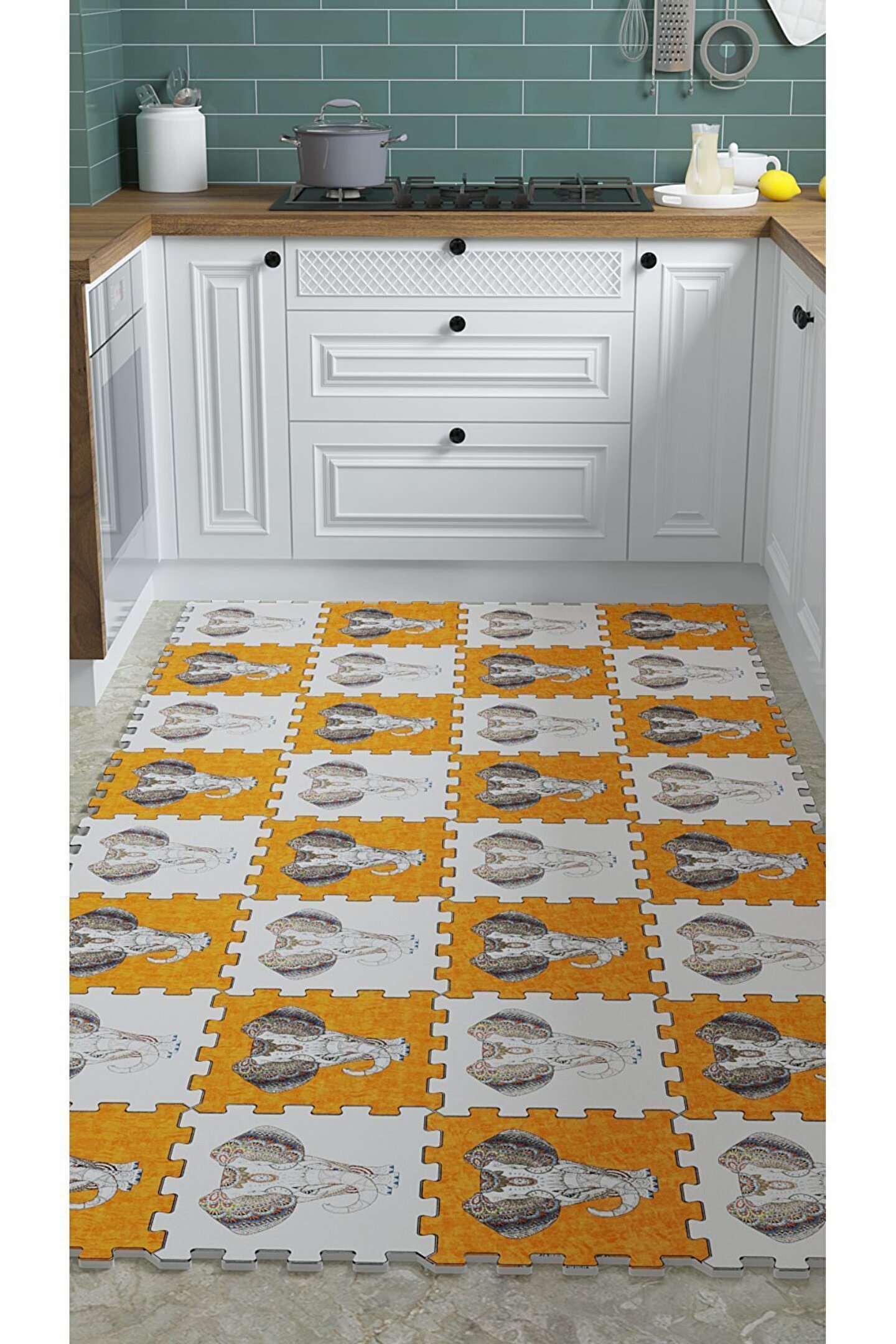 Tokyo Halı Turuncu Filli Yıkanabilir Mutfak Halısı Thm23 | Yapboz Halı | Puzzle Halı
