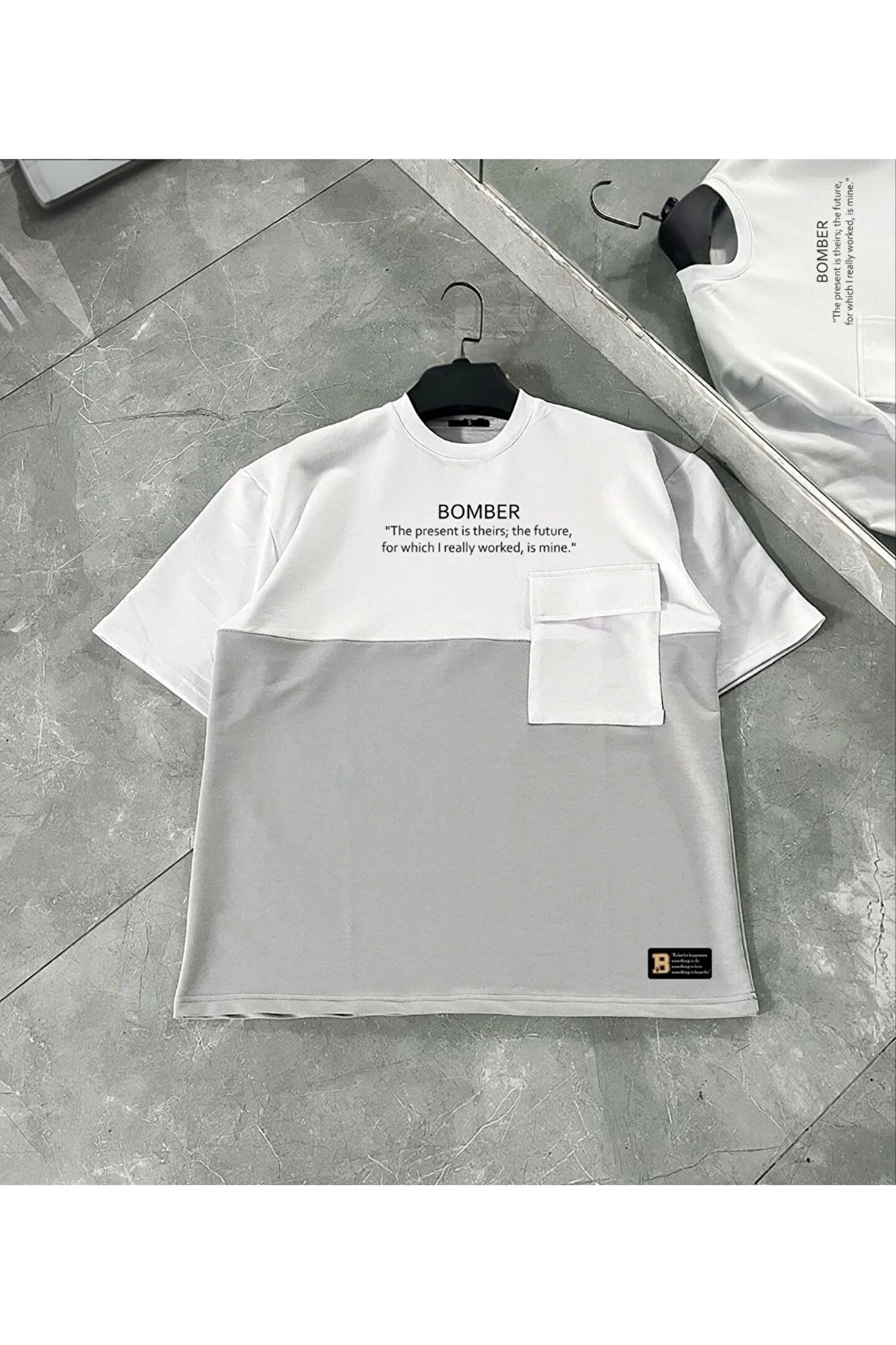 Unisex Torba Cep Detaylı Parçalı T-Shirt - Gri