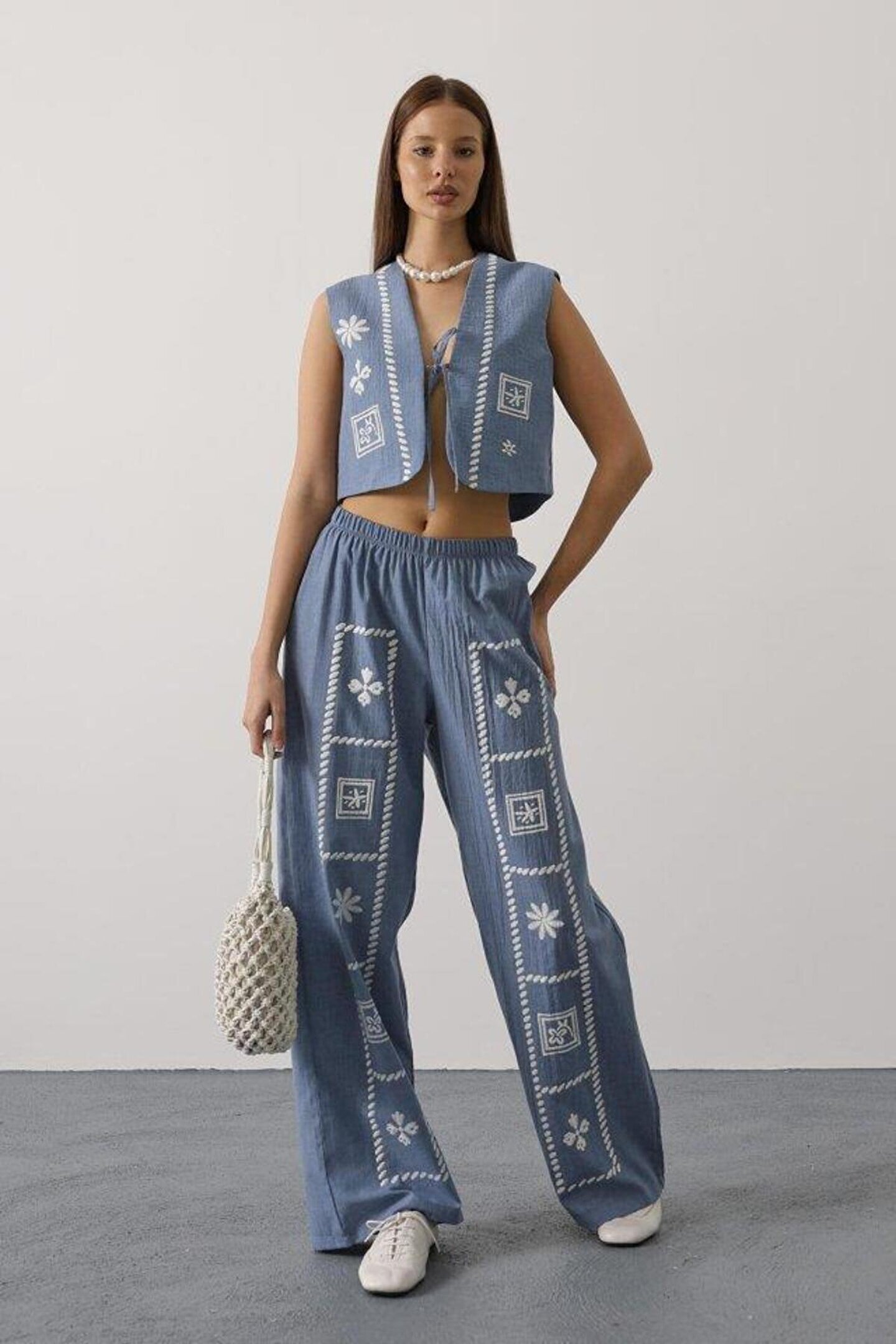 Baskılı Önü Bağlamalı Yelekli Takım - İndigo