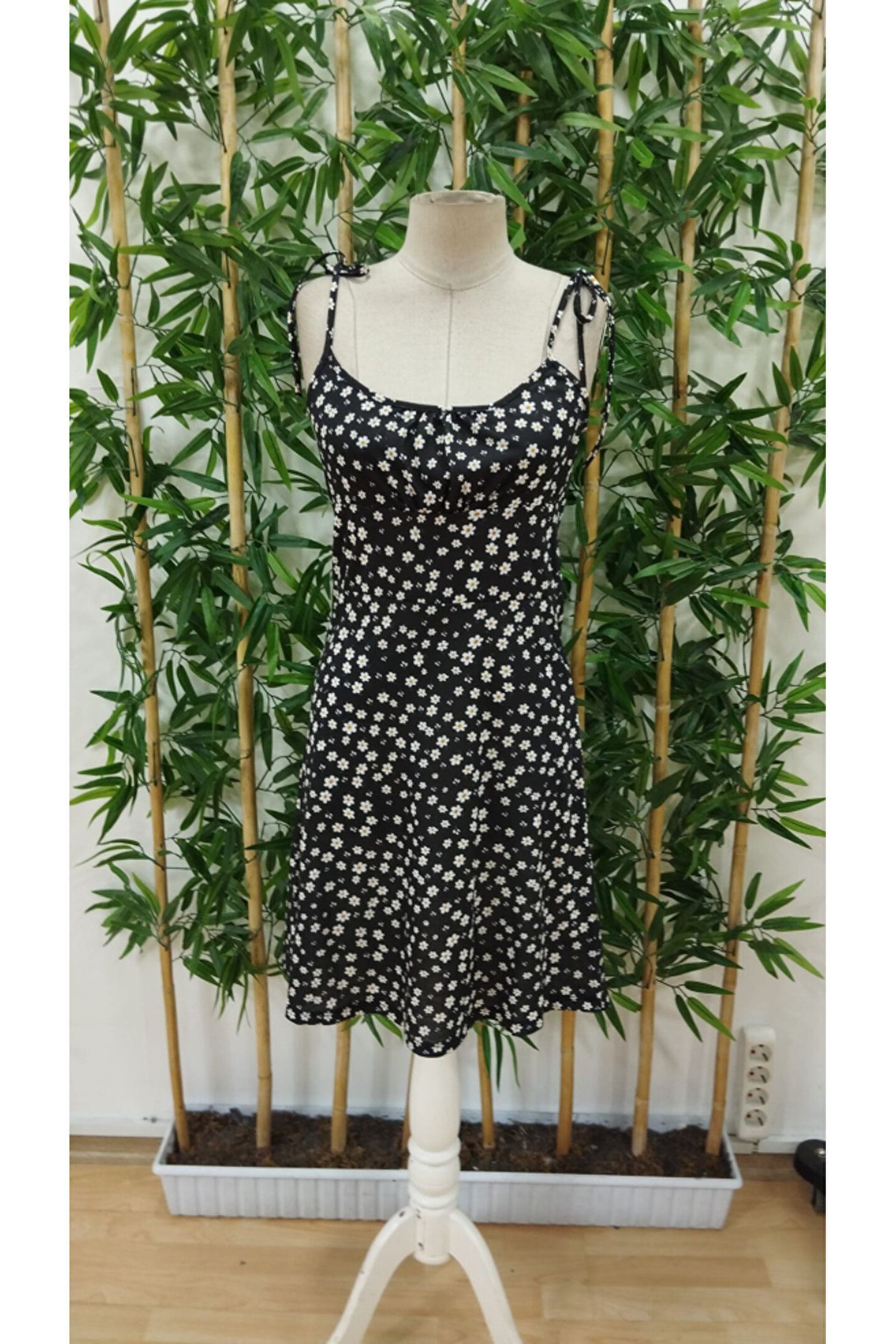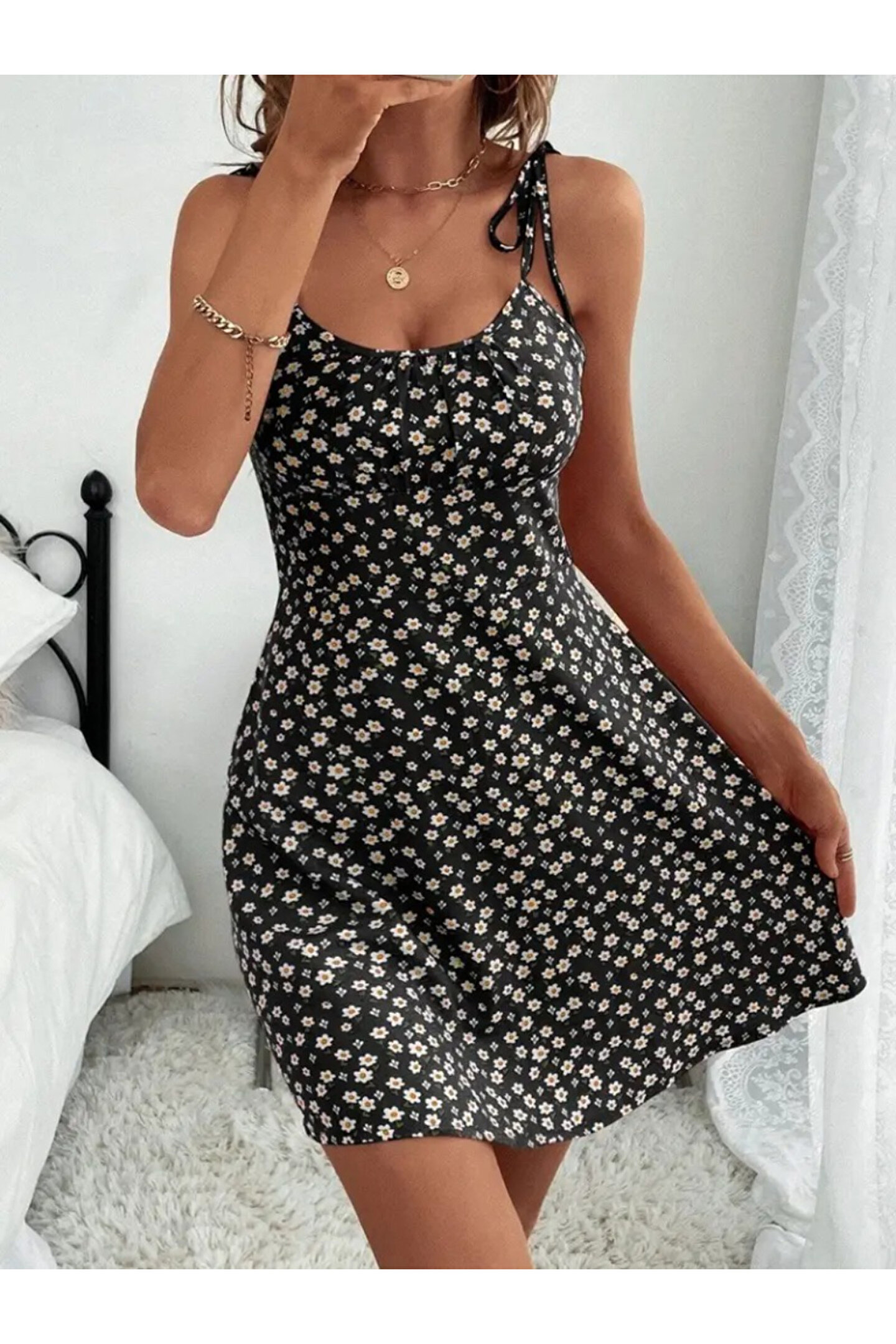 Kadın Ip Askılı Omuzlardan Bağcıklı çiçek Desenli Süprem Elbise