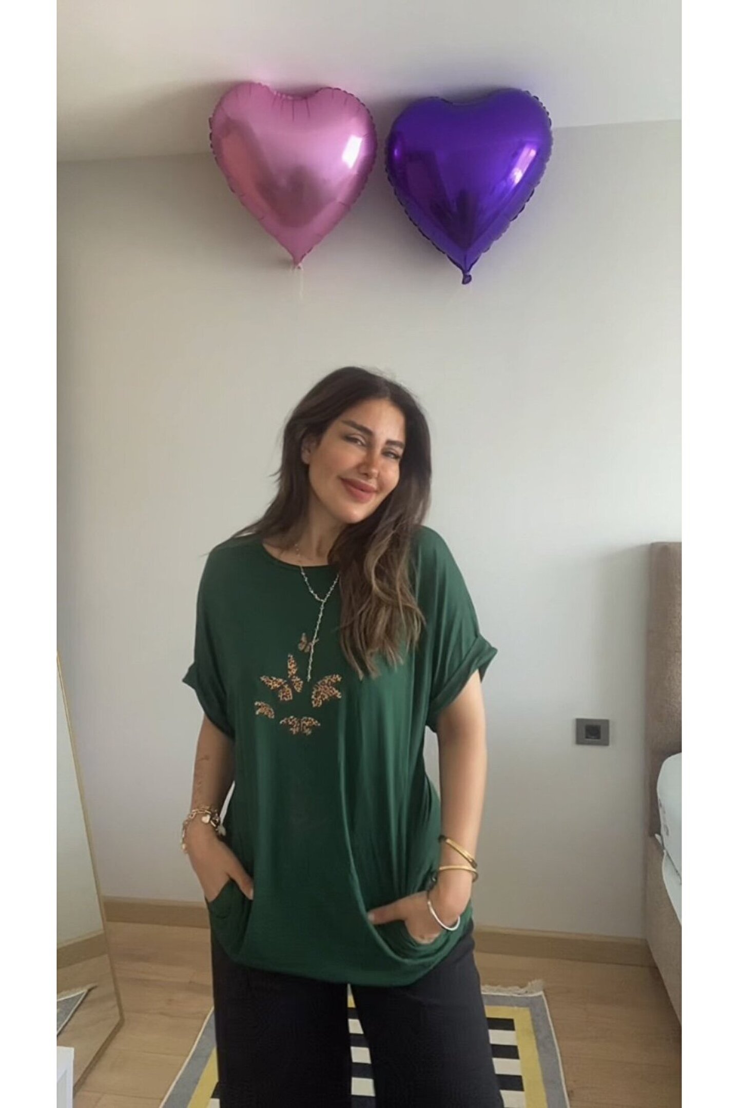 trend_ermege EQURİ Kadın Kısa Kollu Bisiklet Yaka Cepli Kelebek Baskılı Viskon Elbise