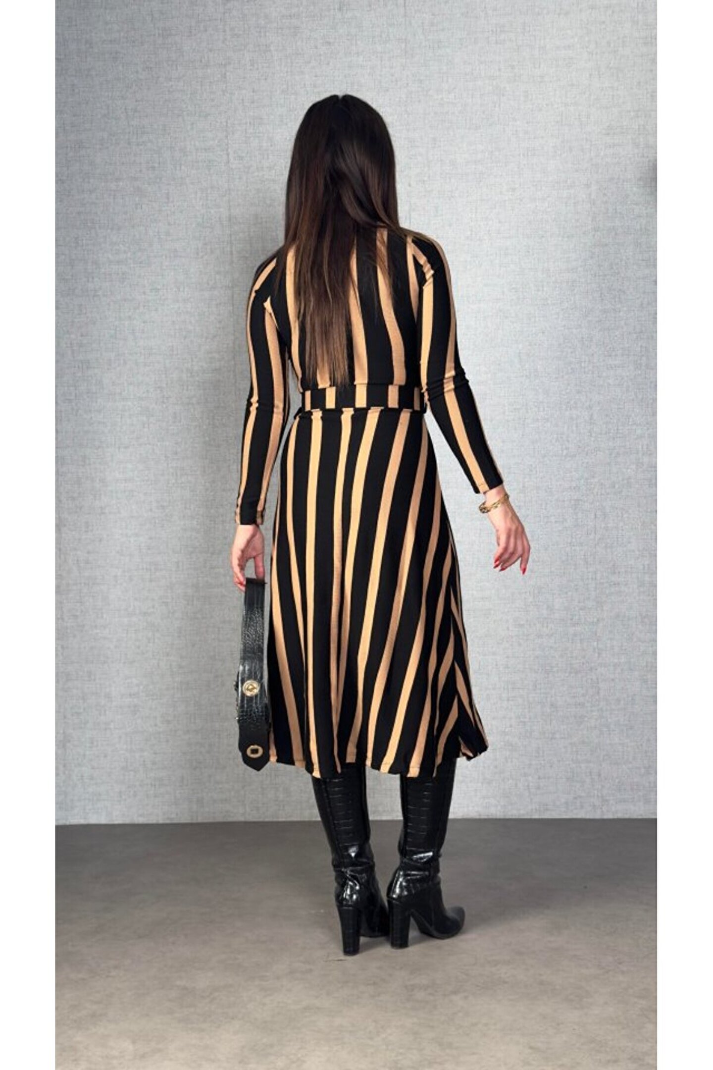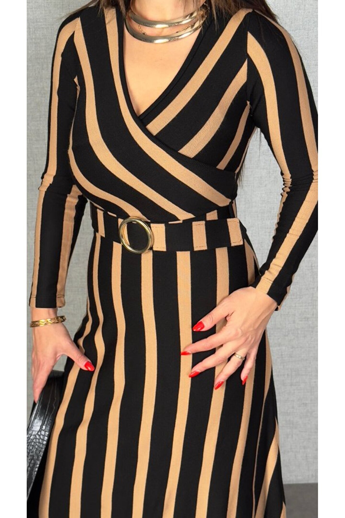 trend_ermege EQURİ Kadın Uzun Kollu Kruvaze Yaka Kemer Dahil çizgili Triko Elbise